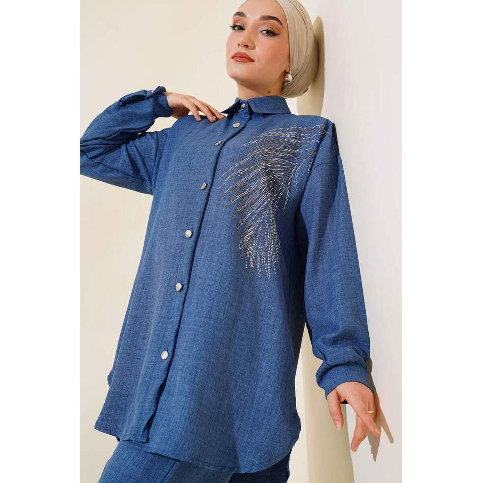 ชุด2ชิ้นผ้าลินินประดับหินสีคราม