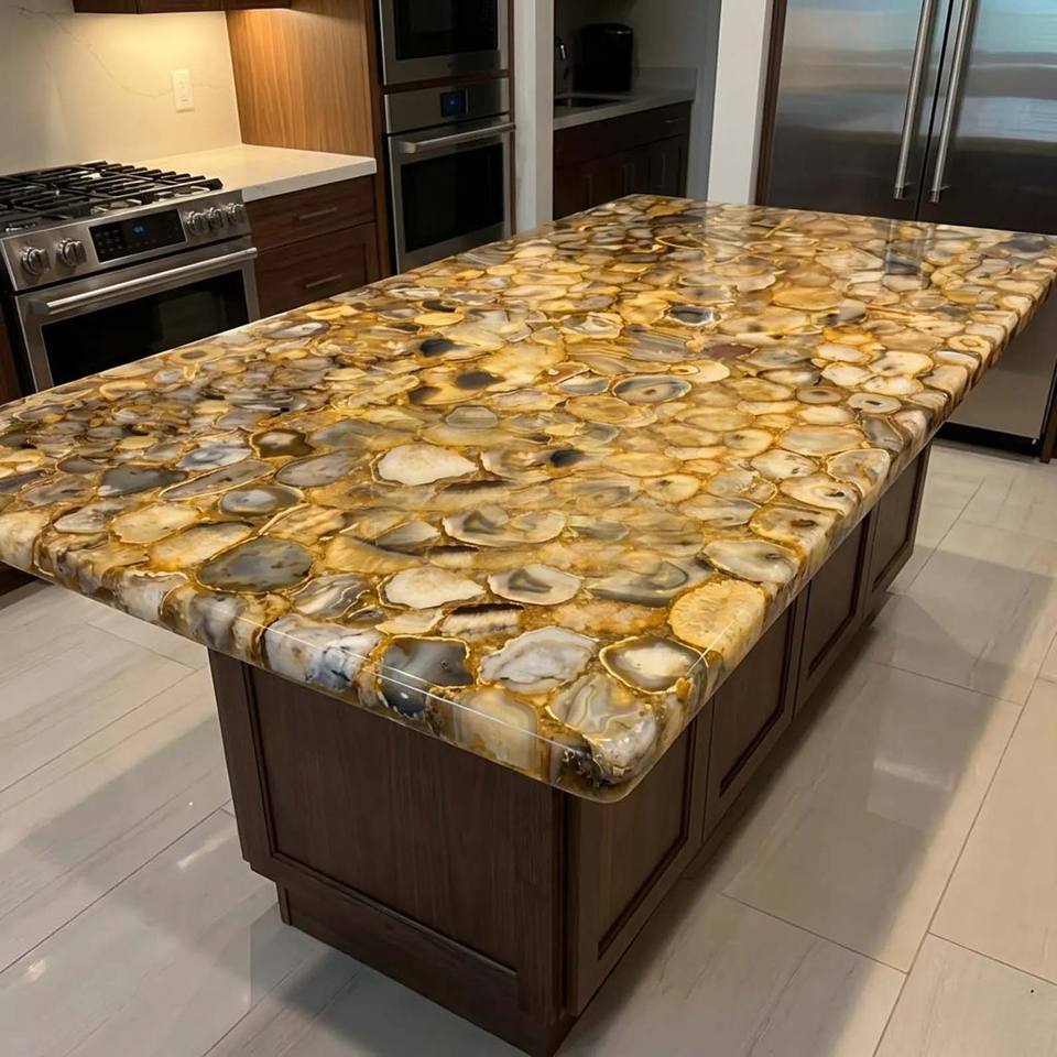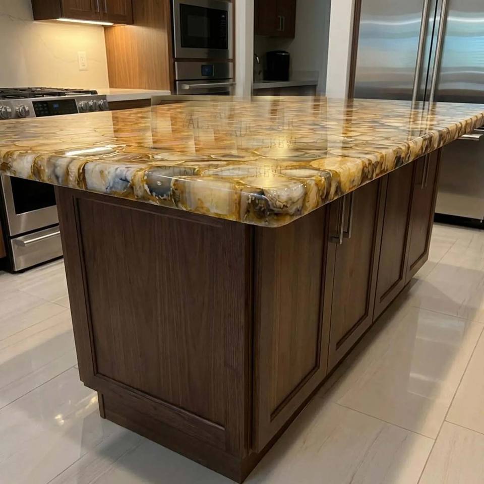 โต๊ะอาหารหินอ่อนธรรมชาติ ผนังพื้นหลังหินอ่อน แผ่นหินอะเกตสีน้ำตาลสำหรับเคาน์เตอร์ครัวแบบโปร่งแสง