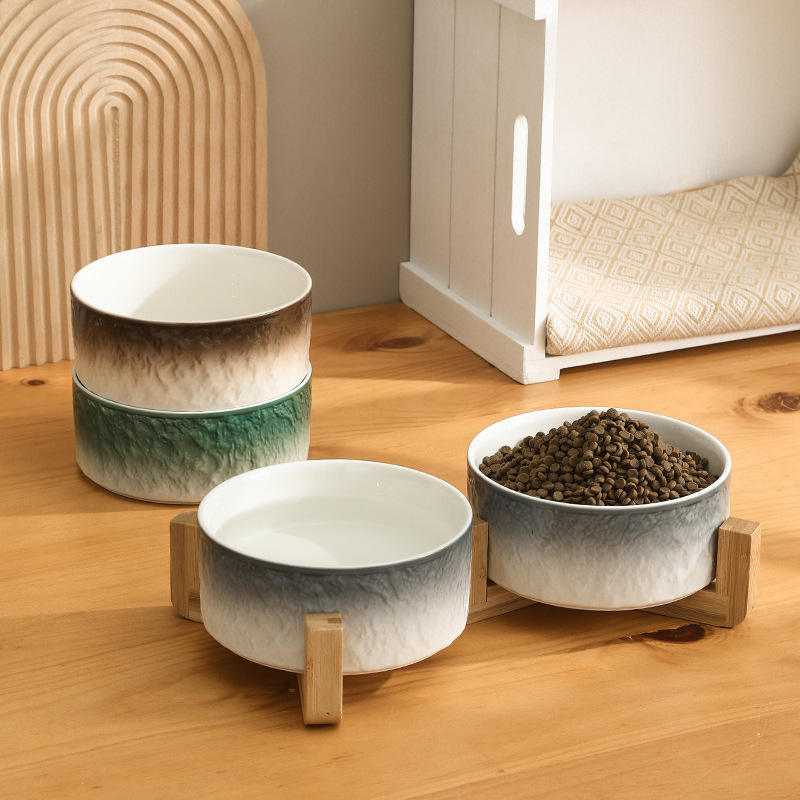 ชามอาหารแมวเซรามิกลายหินชามอาหารสุนัขแมวสองชั้นชามใส่อาหารสัตว์เลี้ยงน้ำสุนัขแบบบูรณาการ