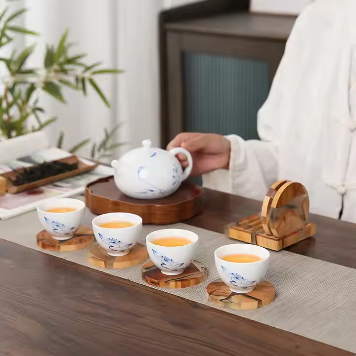 Stone Resin Classic Eco-Friendly Insulated Tea Coasters Cup Holder Set with Solid Wood Base Round Shape Home Use Crescent Crafts