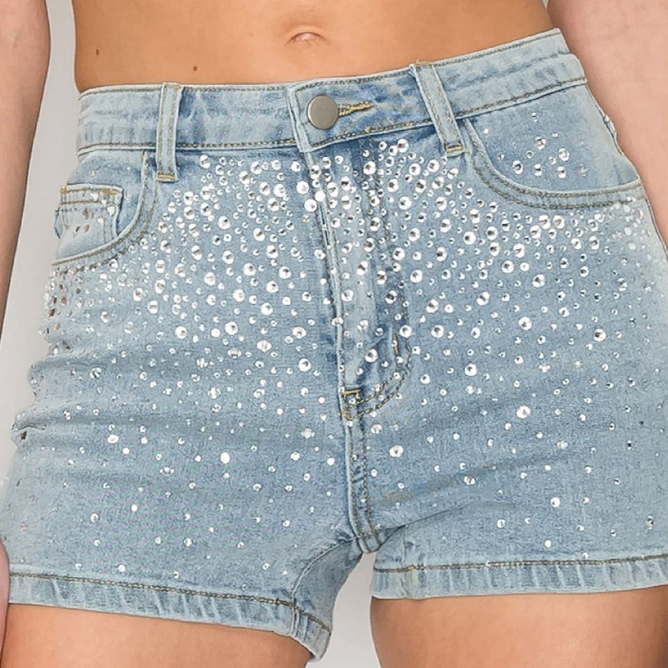 Stone Rimstone กางเกงขาสั้นผ้ายีนส์เอวสูงของผู้หญิง,กางเกงขาสั้นผ้ายีนส์เอวสูงพิมพ์ลายสุดเซ็กซี่