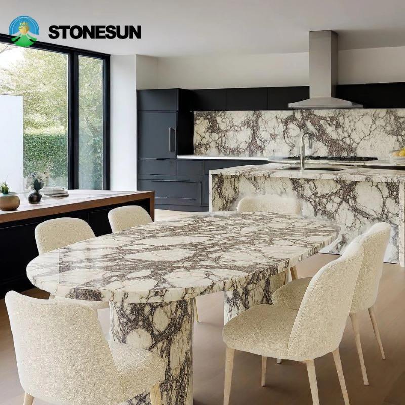 โต๊ะรับประทานอาหารหินอ่อน Calacatta Viola ขนาดสั่งทำพิเศษจาก StoneSun สำหรับ 6 ที่นั่ง โต๊ะอาหารไม้วอลนัทสำหรับร้านอาหาร เหมาะสำหรับเฟอร์นิเจอร์ห้องครัว