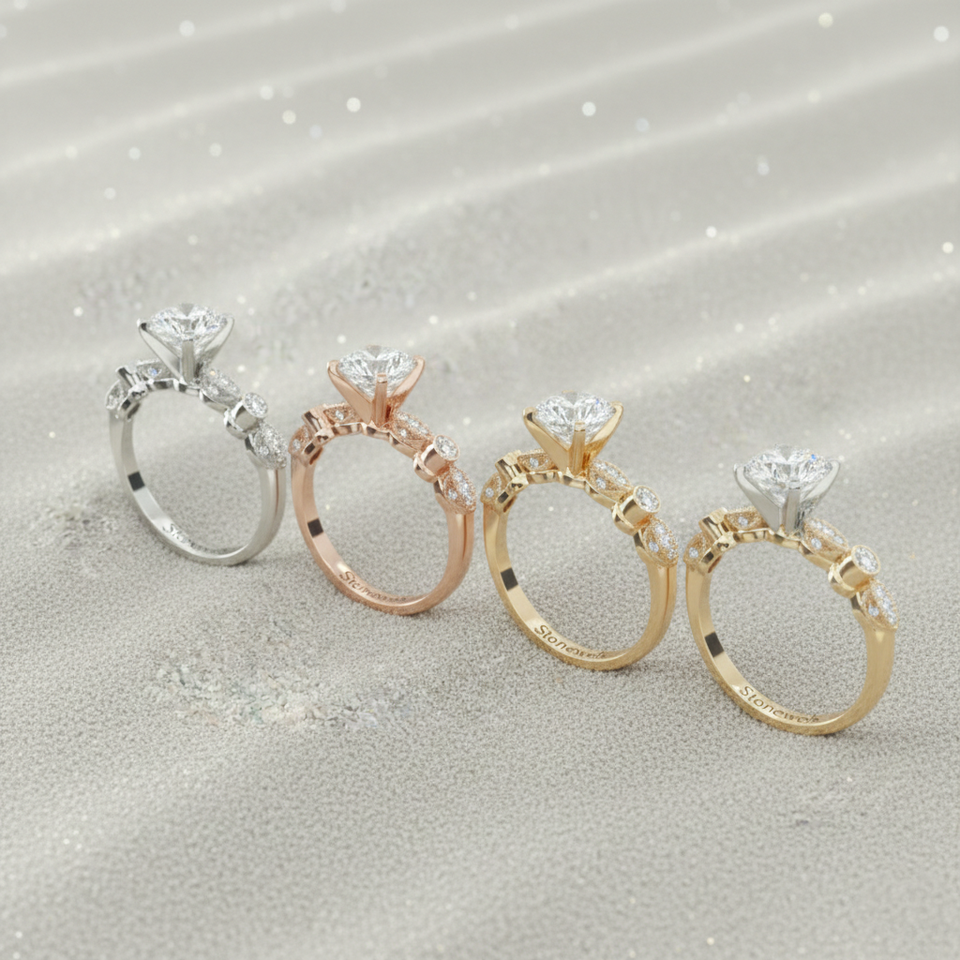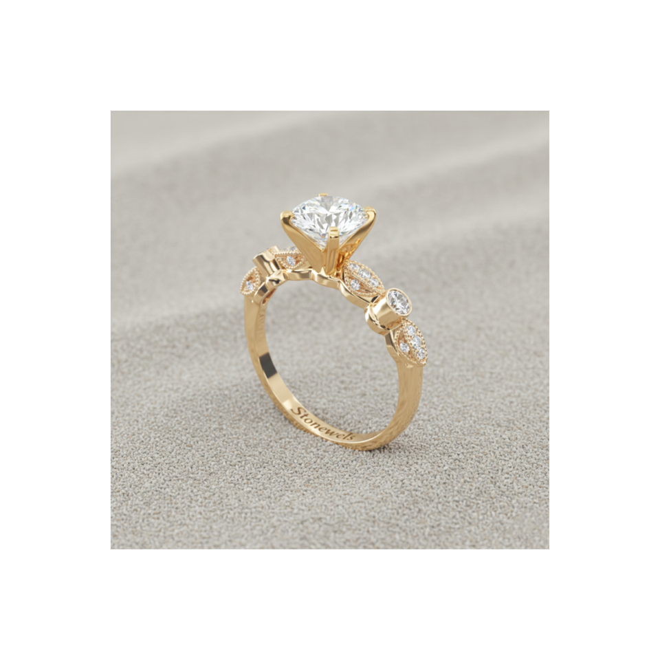 Stonewels Antique Bezel Pav Vintage Engagement Ring Gold Plated | for Certified Lab Grown Diamond | Luxury Prong Set Milgrain