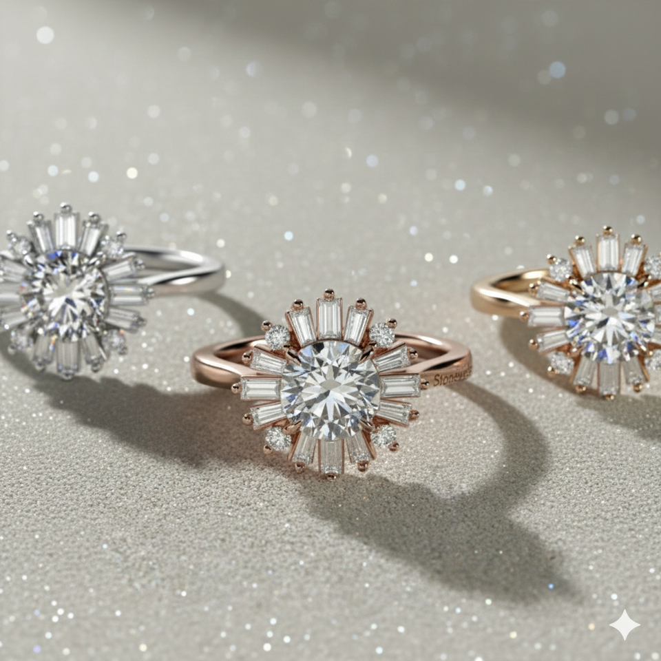 แหวนหมั้นทรงบาเลริน่าประดับเพชรทรงบาแกตต์แบบวินเทจ ยี่ห้อ Stonewels พร้อมใบรับรอง สำหรับทั้งชายและหญิง