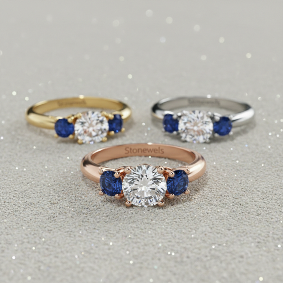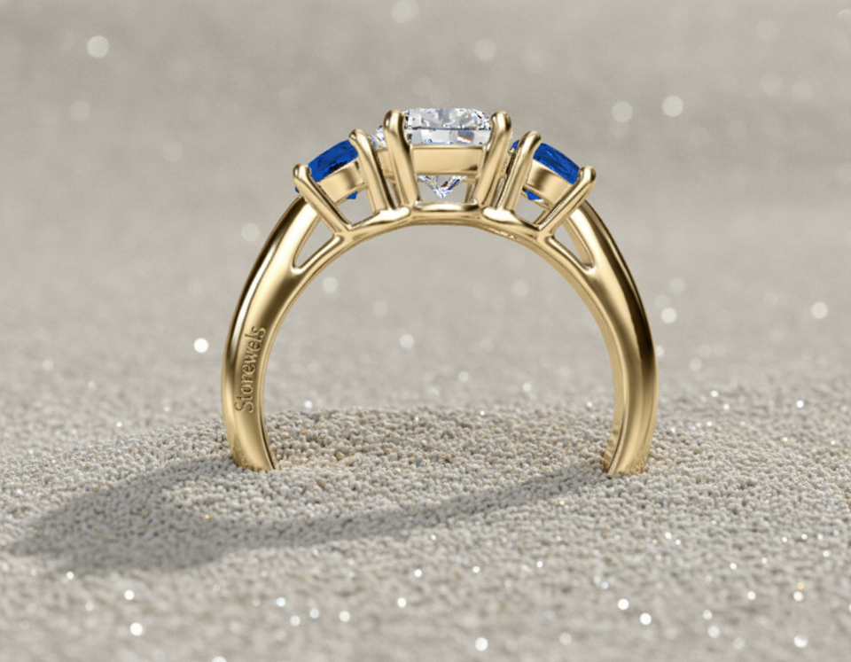 แหวนหมั้นเพชรทรงสามเม็ดจาก Stonewels Lab ประดับด้วยไพลินสีน้ำเงินด้านข้าง พร้อมใบรับรอง แหวนทองคำแท้แบบฝังหนามเตย