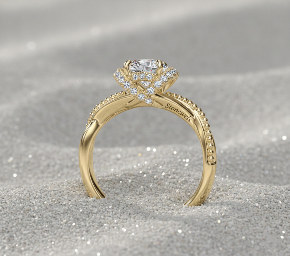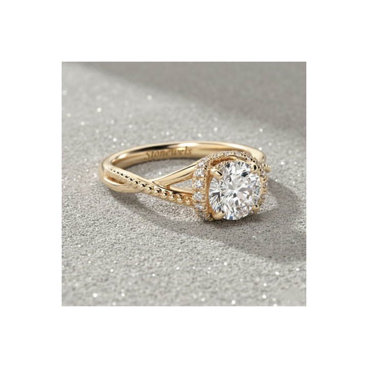 แหวนเพชรสร้างในห้องปฏิบัติการ Stonewels แบบติดกิ่งทอง 14K ทรงวินเทจ ประดับริบบิ้นสไตล์ฮาโล สำหรับเครื่องประดับสั่งทำที่ได้รับการรับรอง