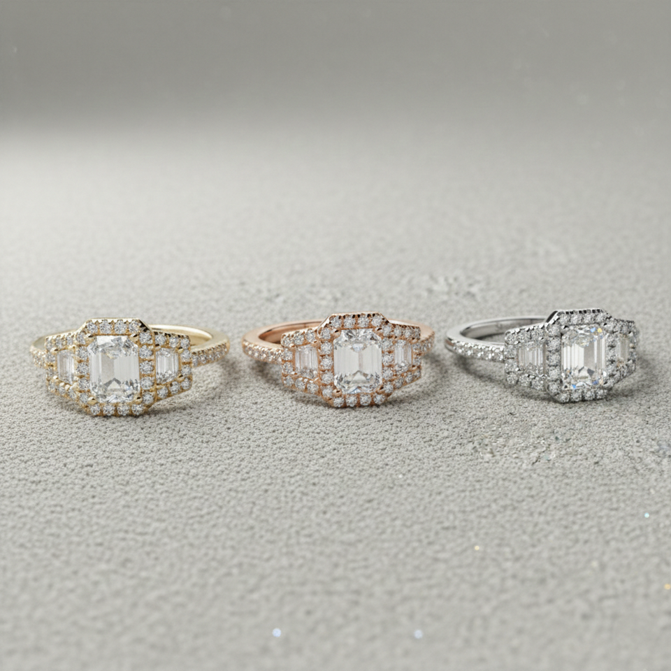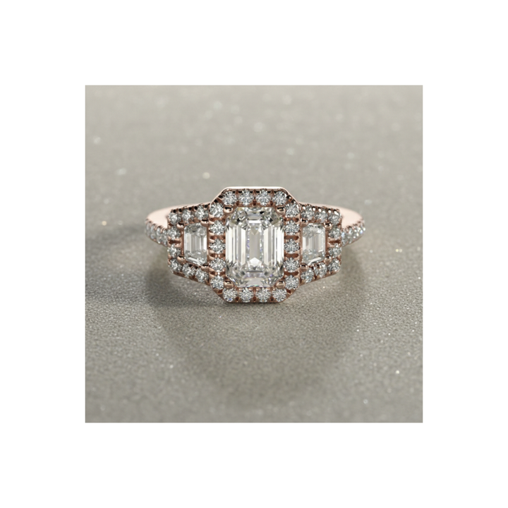 แหวนเพชรทรงสี่เหลี่ยมคางหมูกรอบ ประดับเพชรสามเม็ด