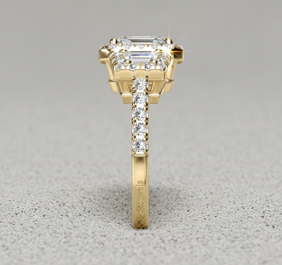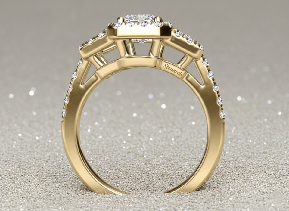 Stonewels ชุดแหวนเจ้าสาวสุดหรูหินด้านข้างทรงสี่เหลี่ยมคางหมูประดับเพชรขนาด14K สีทองสามชิ้นสำหรับปลูกในห้องทดลอง