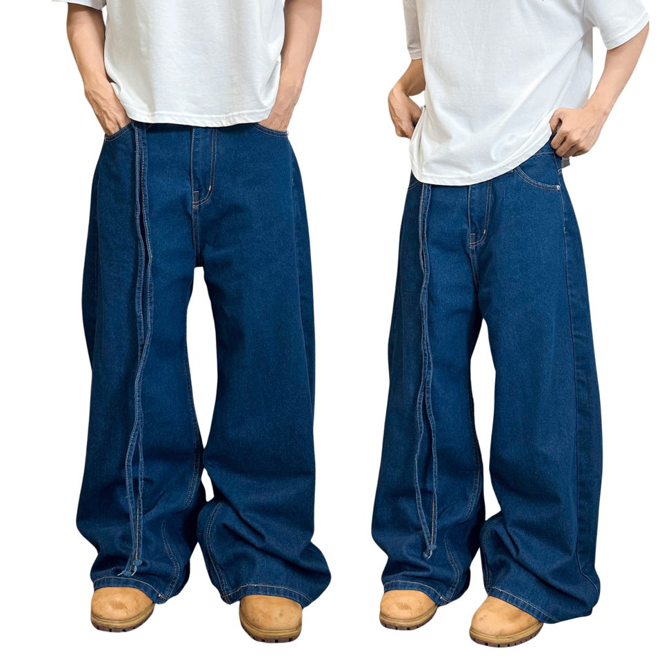 กางเกงยีนส์ทรงตรงผู้ชาย แต่งโลโก้ได้ สไตล์สตรีทแวร์ สีพื้น ลุคทำเก่า พร้อมเชือกผูก
