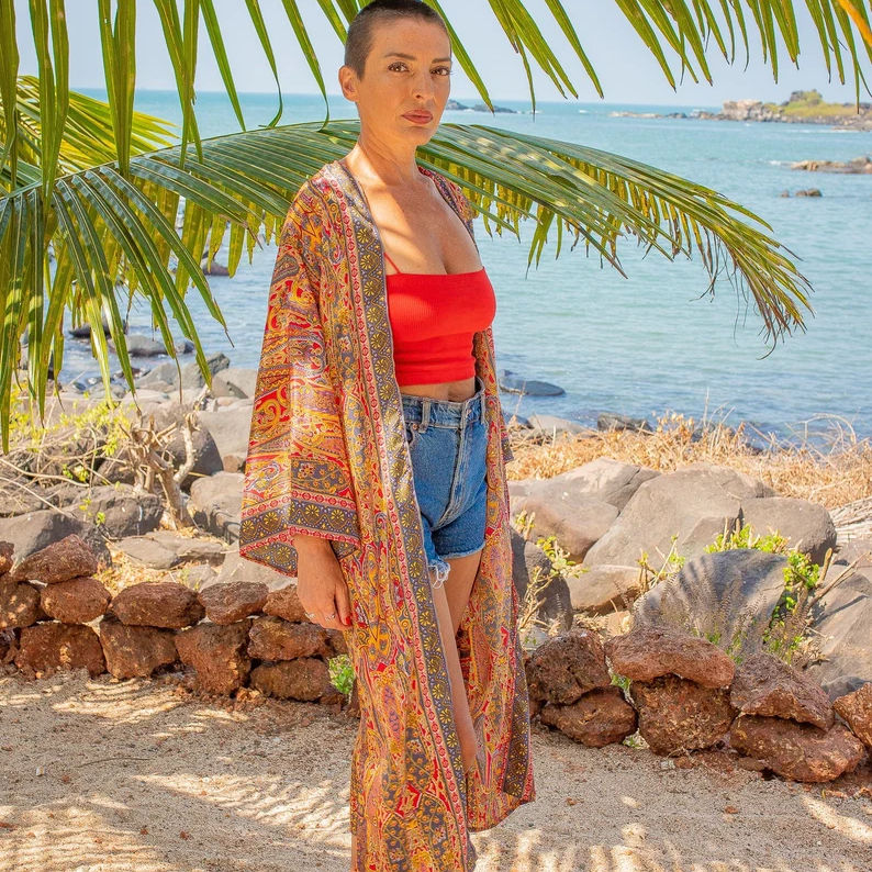 ชุดกิโมโนพิมพ์ลายดอกไม้ของผู้หญิงชุดเดรสชายหาดสไตล์อินเดียลำลองยาวถึงพื้นเอวเป็นธรรมชาติ