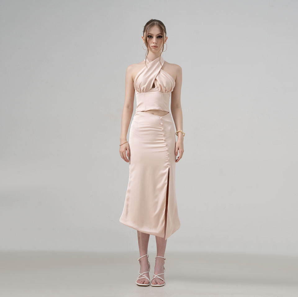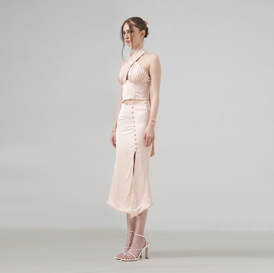 เทคนิค:กระโปรงอคติตัดกับกระดุมด้านหน้ามีรายละเอียดและร่องลึก