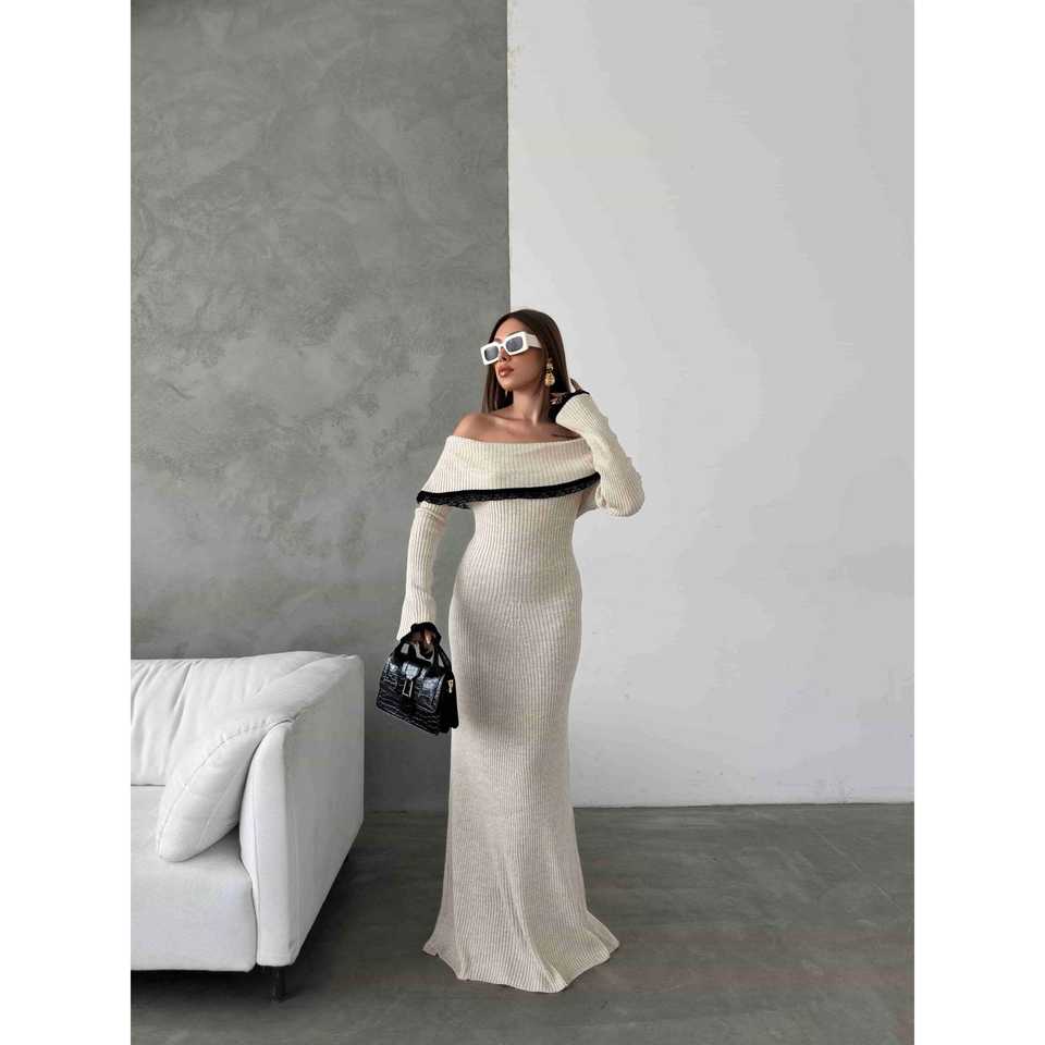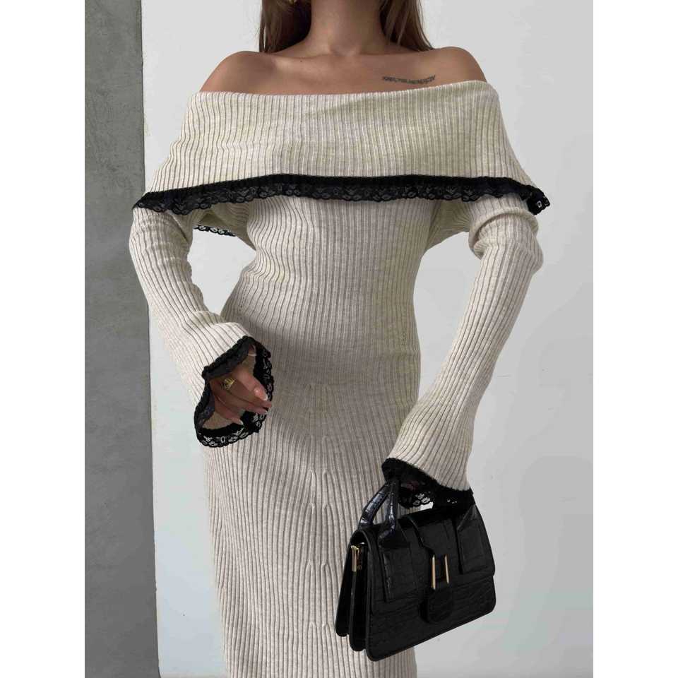 เดรสไหมพรมแต่งลูกไม้แบบไร้สายรุ่น 1513 ดีไซน์เรียบหรู ยาวกรอมพื้น เหมาะสำหรับงานปาร์ตี้ งานเฉลิมฉลอง พร้อมดีเทลผ่าข้าง