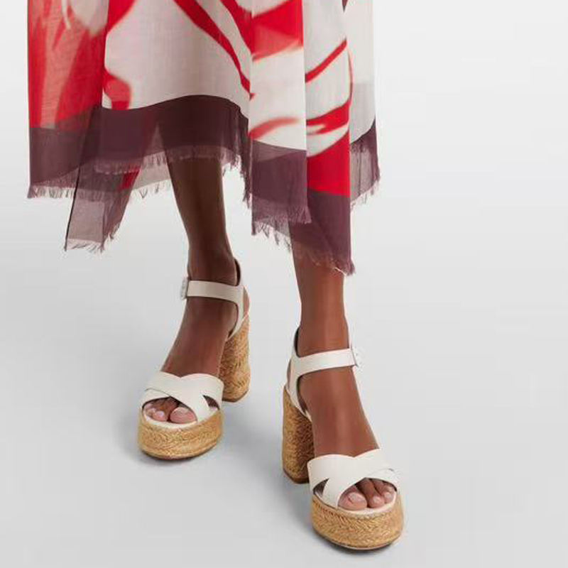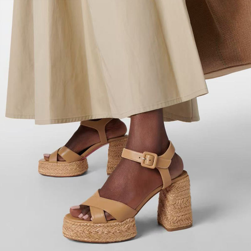 รองเท้าส้นสูงแบบสานด้วยเชือกฟาง สายรัดไขว้ แพลตฟอร์มหนา ปลายเปิดทรงเหลี่ยม รองเท้าแตะแบบสวมสำหรับผู้หญิง พร้อมสายรัดข้อเท้า