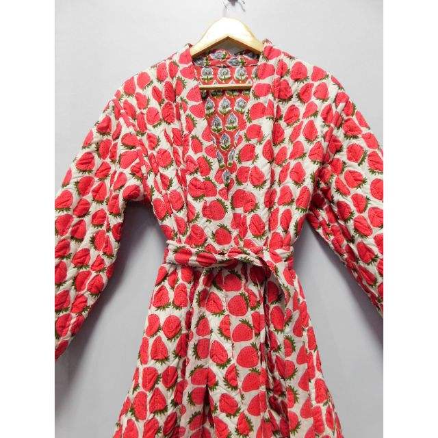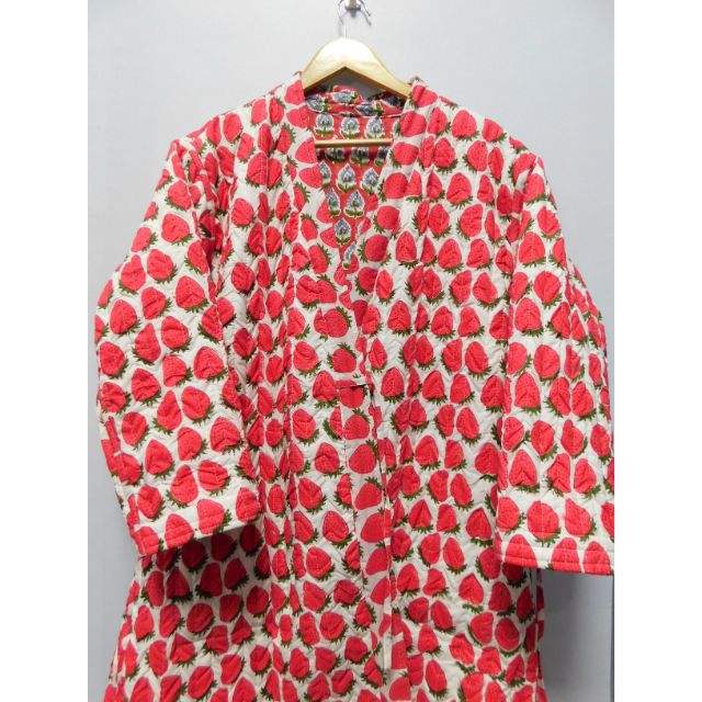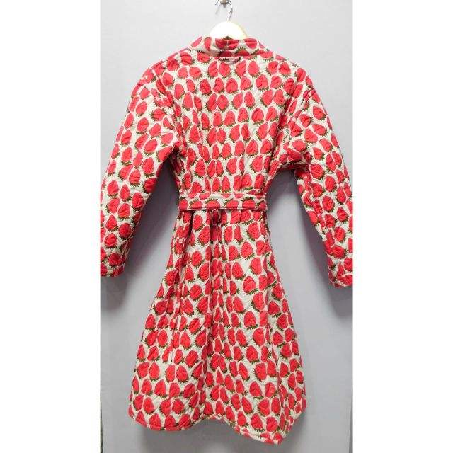 ชุดคลุมอาบน้ำชุดกิโมโนผ้าฝ้ายพิมพ์ลายสตรอเบอร์รี่ชุดยาวสำหรับใส่กลางคืนเสื้อแจ็กเก็ตสำหรับฤดูร้อนและฤดูใบไม้ผลิ