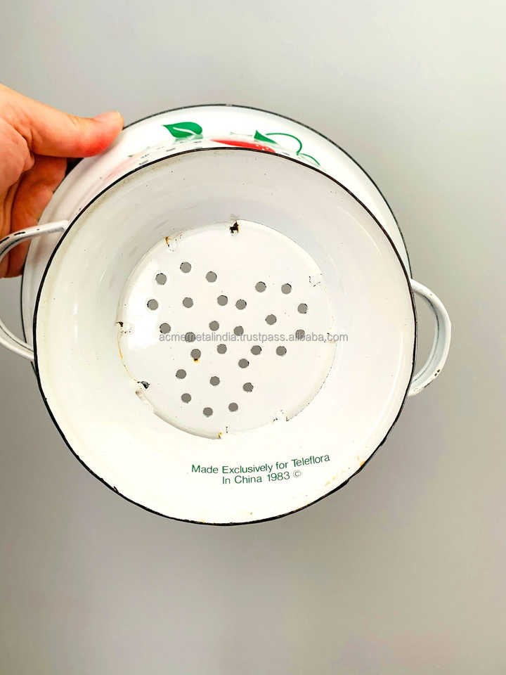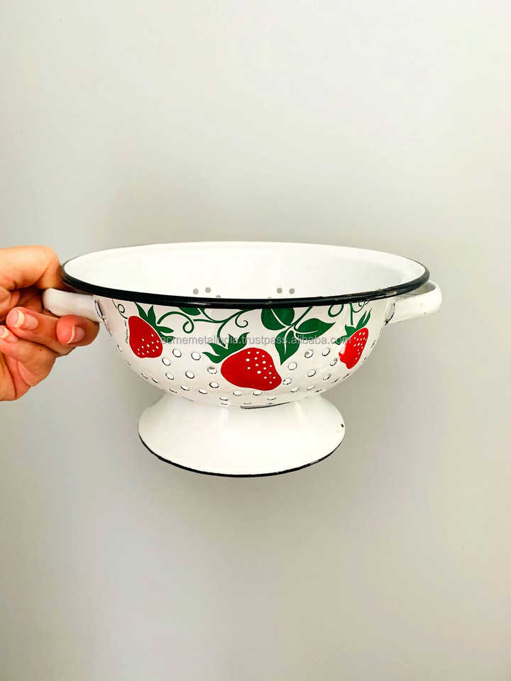 ที่กรองโลหะลายสตรอว์เบอร์รี่เคลือบเอนาเมล ดีไซน์ย้อนยุค เหมาะสำหรับใช้กับเครื่องครัวและชามสไตล์วินเทจ