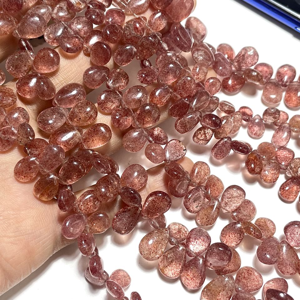 ลูกปัดควอทซ์สตรอเบอรี่แบบเรียบลูกปัดถักทอ7เส้นรูปทรงลูกแพร์ลูกปัดหิน