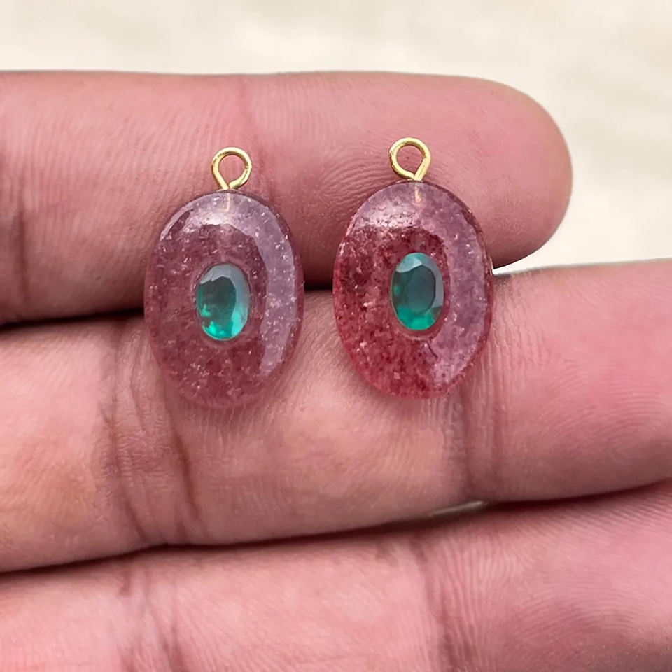 จี้พลอยรูปวงรีควอตซ์สตรอเบอร์รี่และนิลขนาด13x17มม. พร้อมห่วงชุบทองทำด้วยมือ