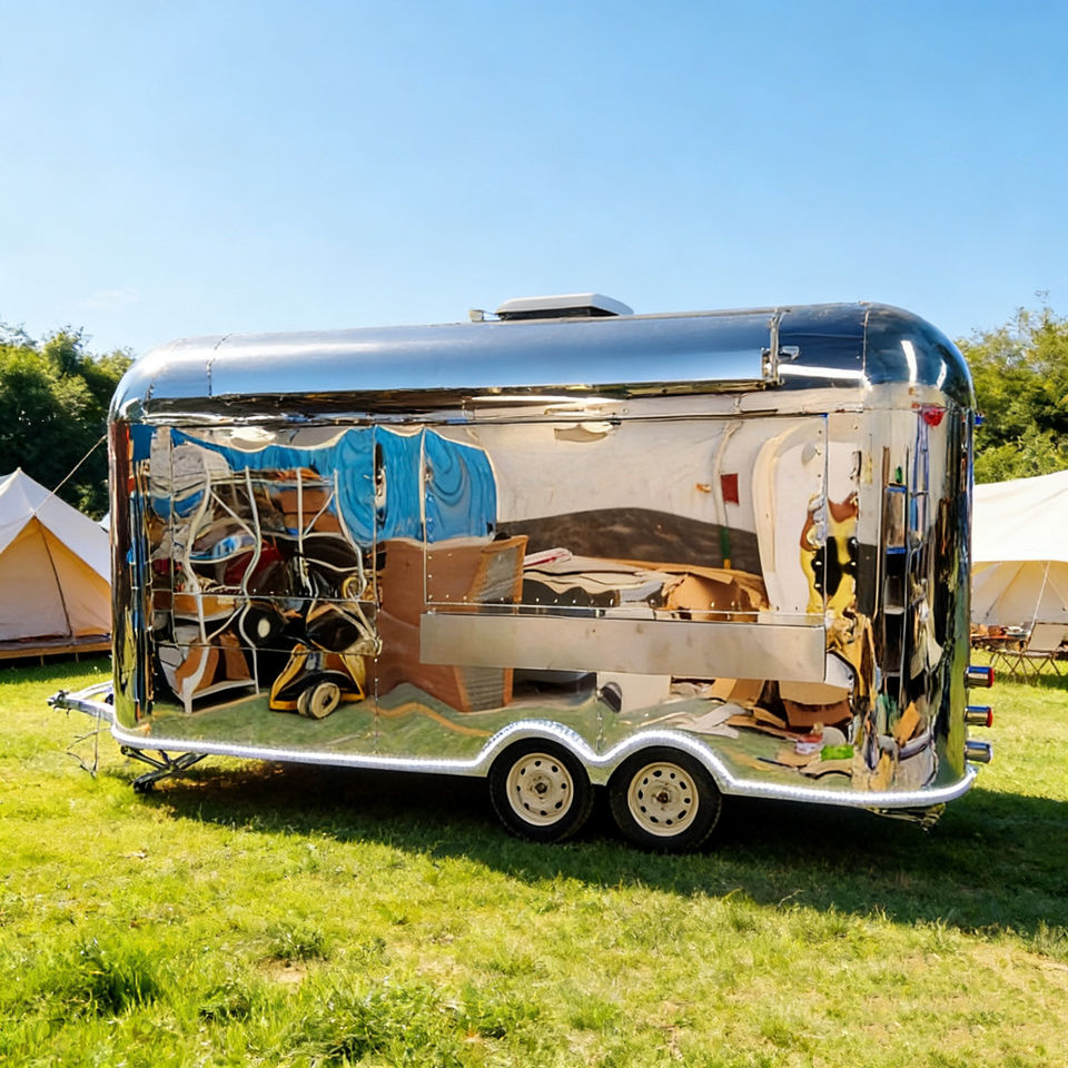 รถเข็นขายของสแตนเลสทรงเรียบหรูสไตล์เรโทรแอร์สตรีม สำหรับขายขนมและเครื่องดื่ม พร้อมล้อเลื่อนลื่นไหล