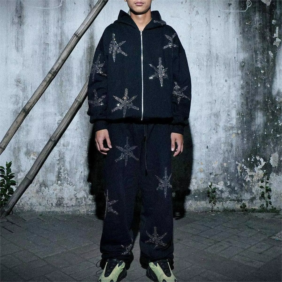 ชุดวอร์มแนวสตรีทแบบมีซิปรูดทรงหลวมสำหรับผู้ชายชุดวอร์มแนวสตรีทแบบลำลองมีฮู้ดและกางเกงสำหรับฤดูใบไม้ผลิและฤดูใบไม้ร่วง