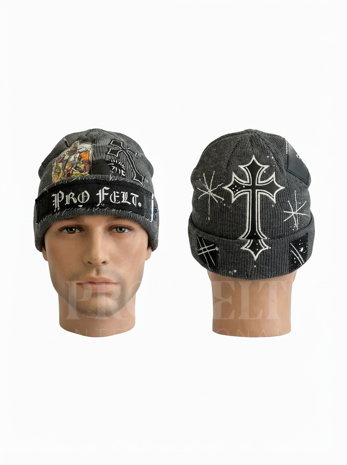 หมวกบีนนี่ถักสไตล์สตรีท ลายปักกากบาทและดีไซน์แบบแพทช์เวิร์ค อุ่น นุ่ม ใส่ได้ทั้งชายและหญิง แฟชั่นฤดูหนาว หมวกบีนนี่ลายแจ็คการ์ด