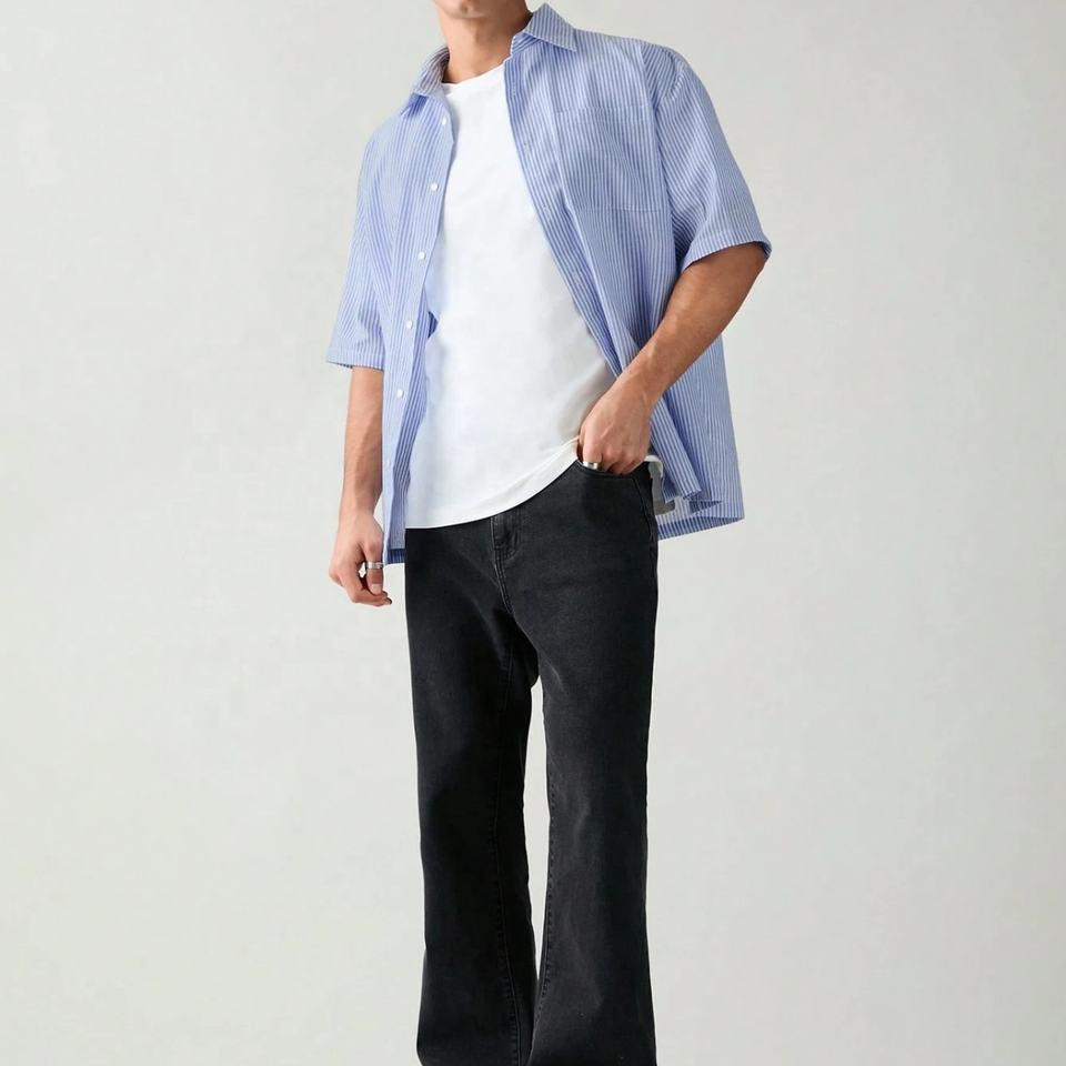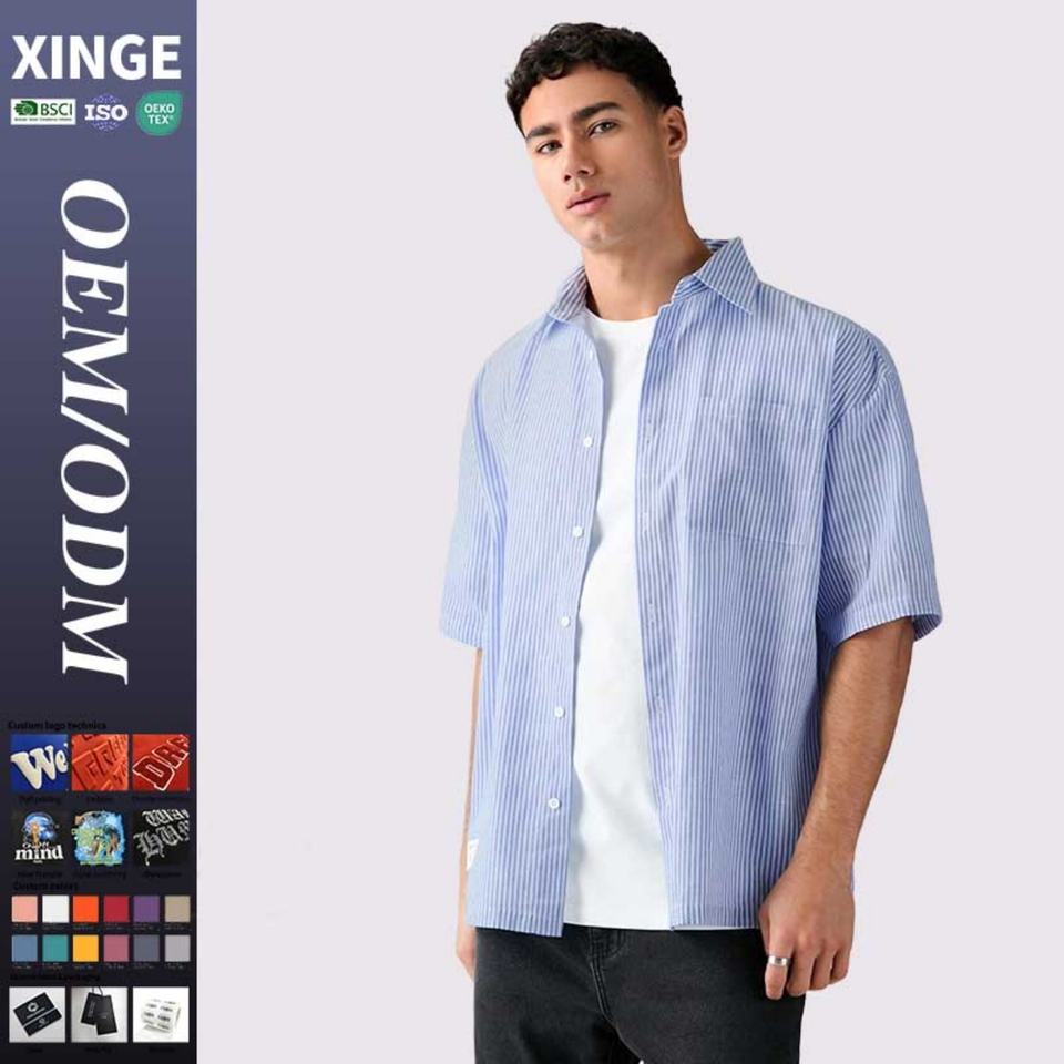 เสื้อเชิ้ตแขนสั้นลายทางสไตล์ลำลองสำหรับฤดูร้อน ปักโลโก้ตามสั่ง ทรงหลวมไหล่ตก ลายสก็อต เสื้อเชิ้ตผู้ชาย