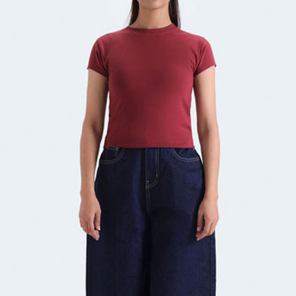 เสื้อยืดคอกลมสีแดงเลือดหมูพิมพ์โลโก้ตามสั่งสำหรับผู้หญิง ผลิตในปากีสถาน เสื้อยืดสีพื้นทรงพอดีตัว ผ้าฝ้ายยืดหยุ่น