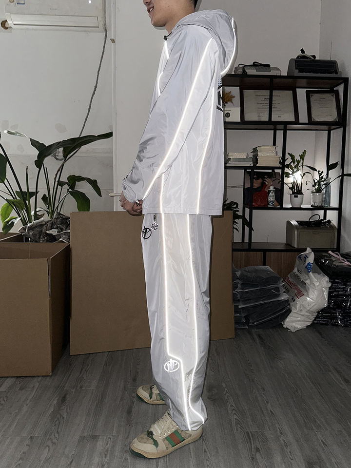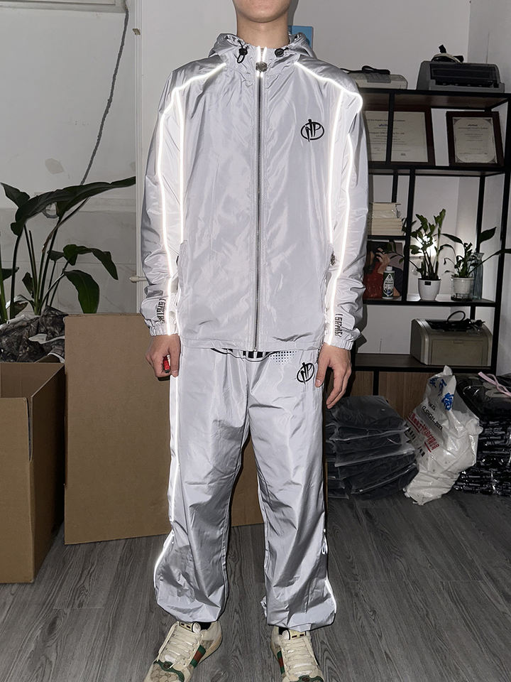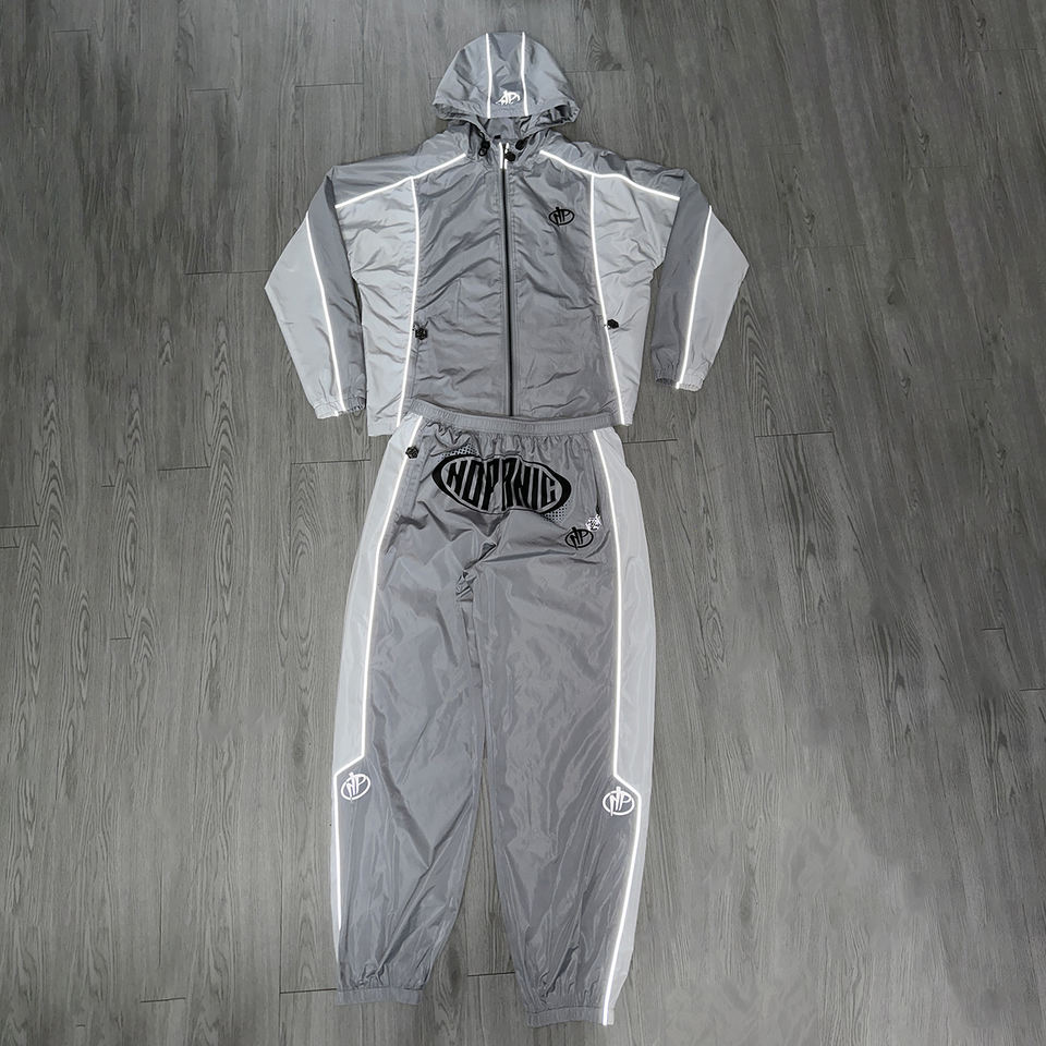ชุดวอร์มผ้าไนลอนเสื้อมีฮู้ดและกางเกงวอร์มคอกลมสำหรับผู้ชาย