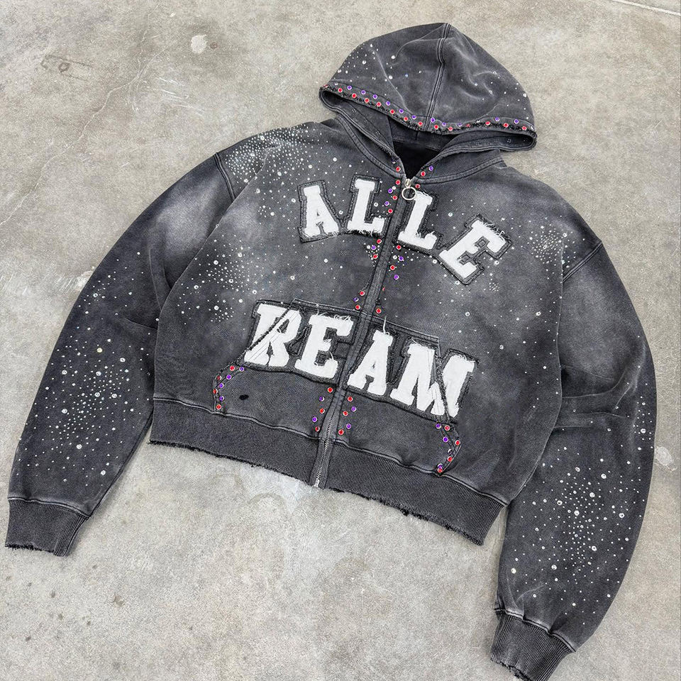 เสื้อฮู้ดครอปซิปผ้าฝ้ายเนื้อนุ่มฟอกสีสไตล์สตรีทแวร์ ประดับคริสตัลปักลาย ดีไซน์เฉพาะตัวสำหรับผู้ชาย สไตล์ฮิปฮอป