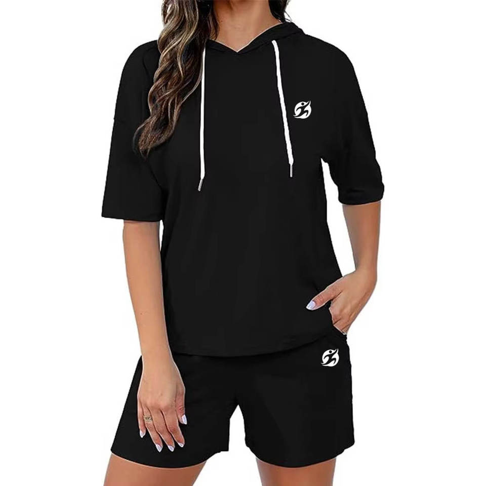 ชุดวอร์มลำลองสำหรับผู้หญิงชุดเสื้อมีฮู้ดและกางเกงขาสั้นผ้าฝ้าย100% แบบเย็บปักสีพื้น