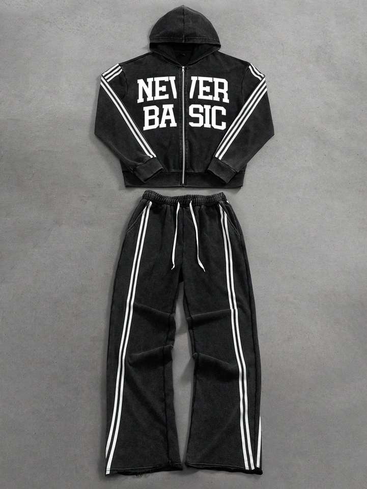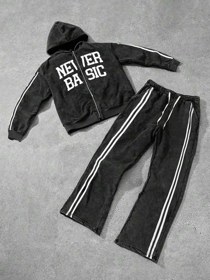 ชุดเซ็ตเสื้อฮู้ดมีซิปและกางเกงขายาวสไตล์สตรีทแวร์ Streetrush สำหรับทุกเพศ น้ำหนักเบา ระบายอากาศได้ดี พิมพ์ลายตัวอักษร แถบข้างตัวเสื้อ