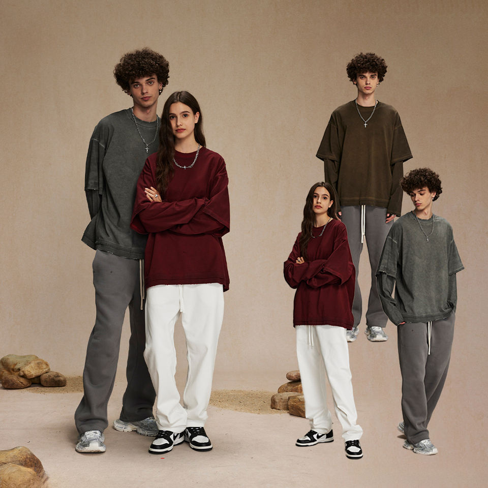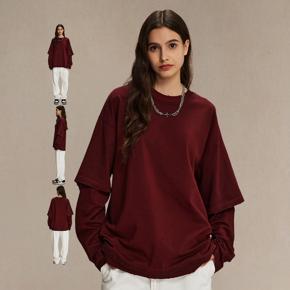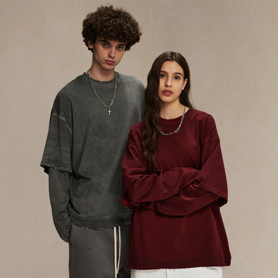 เสื้อยืดสองชั้นแขนยาวสำหรับผู้ชายพิมพ์ลายสตรีทแวร์แบบกำหนดเองเสื้อยืดสองชั้นซักได้สำหรับผู้ชาย