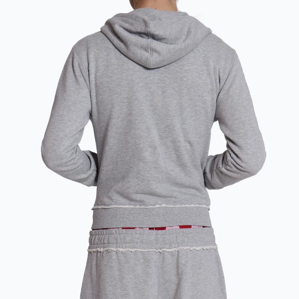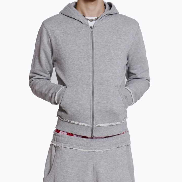เสื้อฮู้ดดี้สตรีทแวร์ทรงสลิมผ้าฝ้ายฟลีซบุขนด้านในสำหรับผู้ชาย แบบเรียบสีพื้น ขอบดิบ ตัดสั้น ซิปหน้า