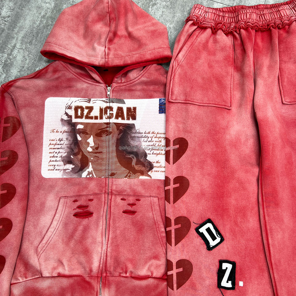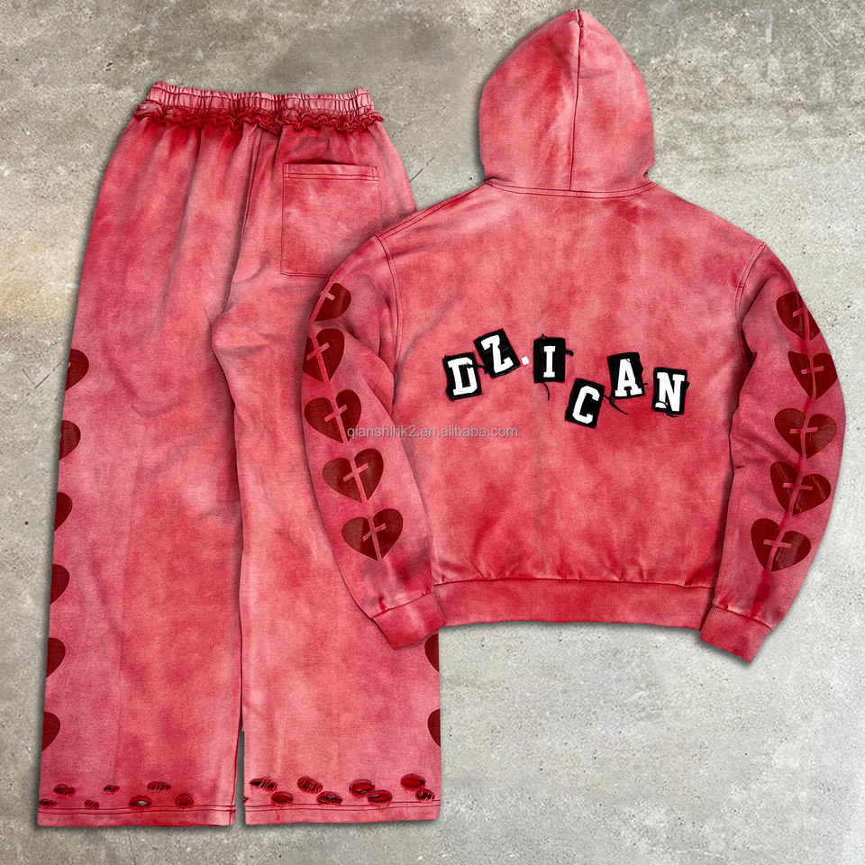 ชุดเซ็ตสตรีทแวร์สุดเท่สำหรับผู้ชาย เสื้อฮู้ดดี้และกางเกงขายาวทรงแบ็กกี้ ลวดลายปักแบบดิสเทรส ล้างสีแบบแอซิดวอช