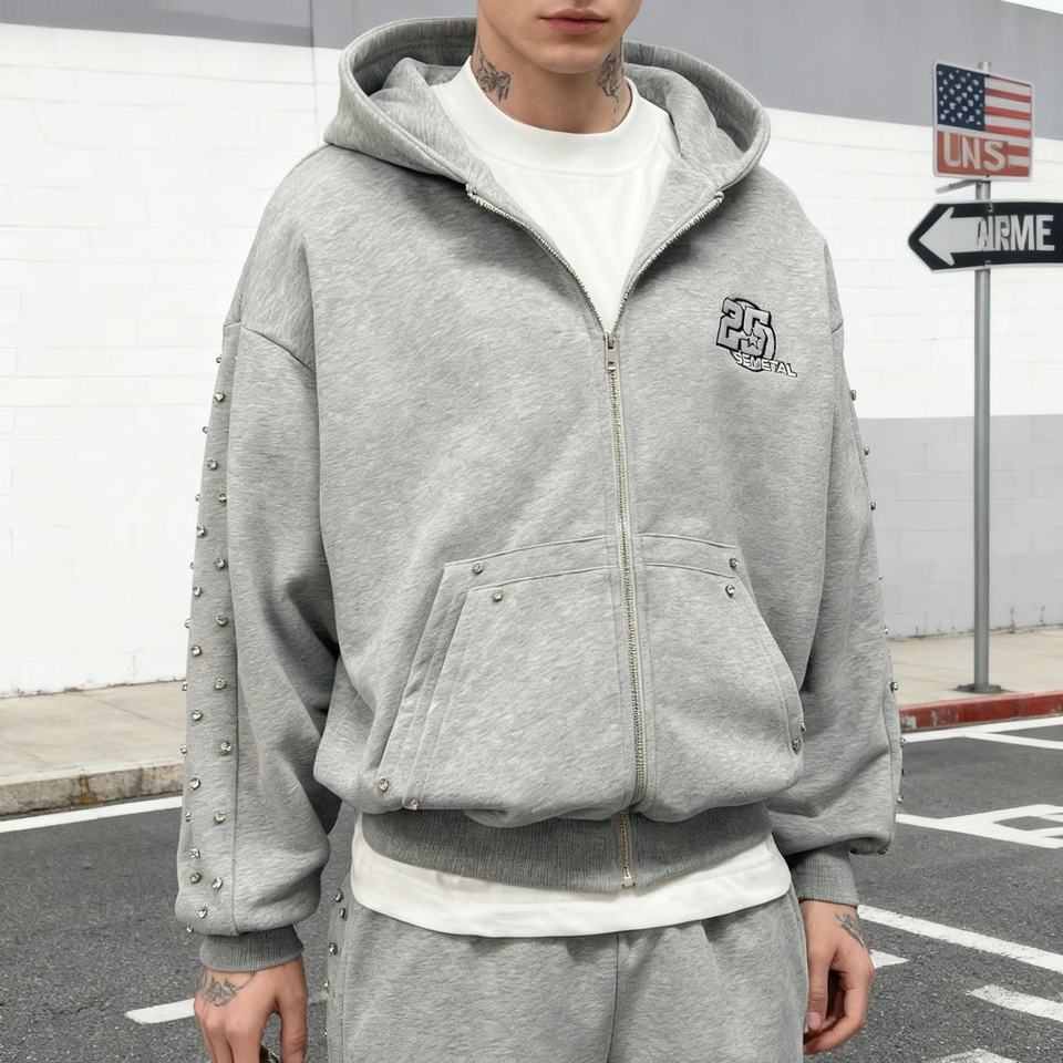 เสื้อฮู้ดดี้ผู้ชายผ้าฝ้าย 100% สไตล์สตรีทแวร์ หนานุ่ม ดีไซน์เนอร์ เสื้อสเวตเชิ้ตเฟรนช์เทอร์รี่ ทรงบ็อกซี่ ประดับคริสตัล ซิปหน้า ผู้ผลิตเสื้อฮู้ดดี้