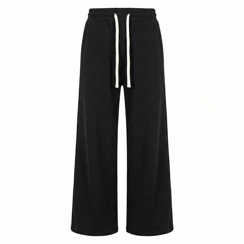 กางเกงสเวตแพนท์ทรงหลวมสีดำผ้าคอตตอนหนานุ่มสไตล์สตรีทแวร์ แบบโอเวอร์ไซส์ พร้อมเชือกผูกสีขาว เป็นมิตรต่อสิ่งแวดล้อม เหมาะสำหรับผู้ชาย
