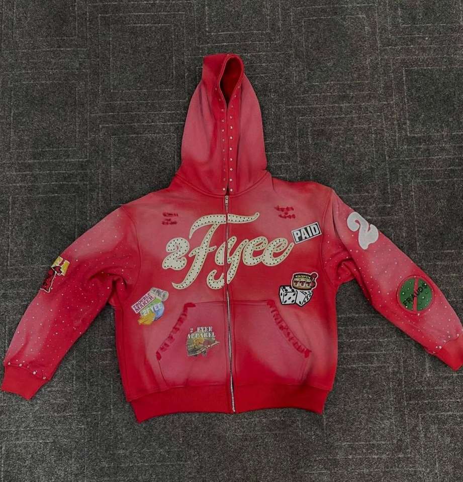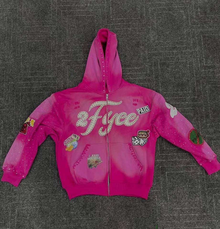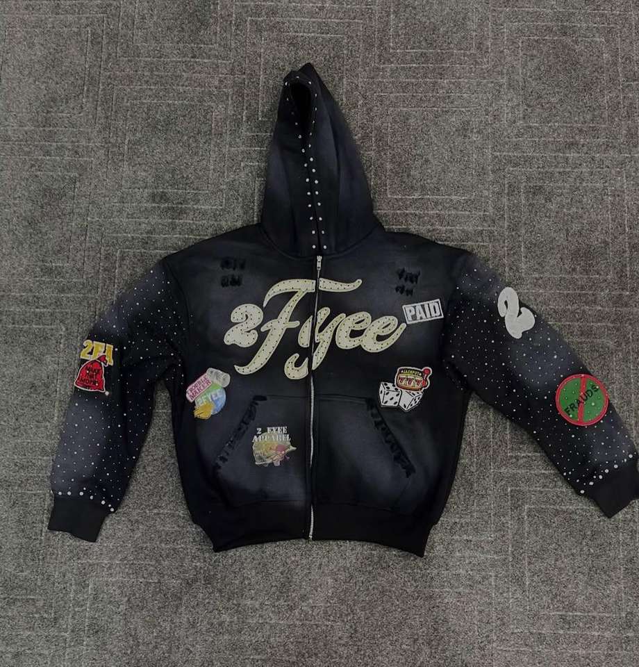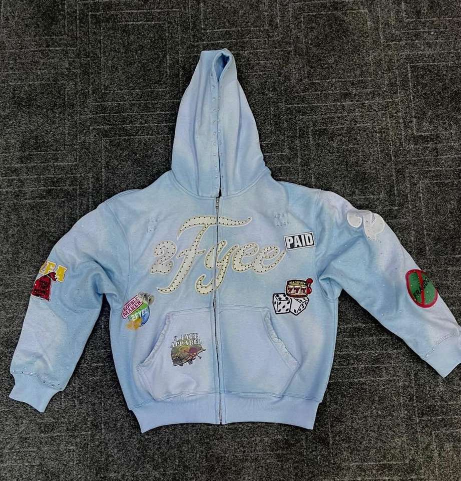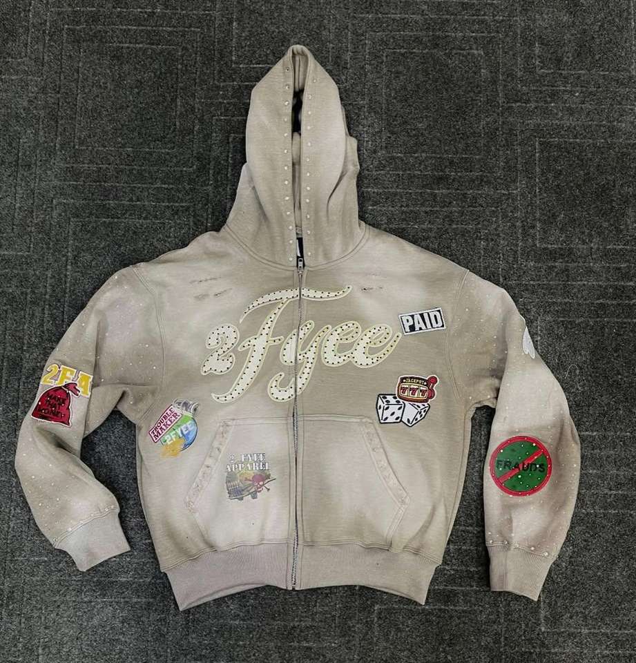 เสื้อฮู้ดดี้สตรีทแวร์ปักลายตัวอักษร แต่งสเปรย์ทำสีซีดแบบแอซิดวอช ประดับคริสตัล ดีไซน์โอเวอร์ไซส์ ซิปหน้า สำหรับผู้ชาย