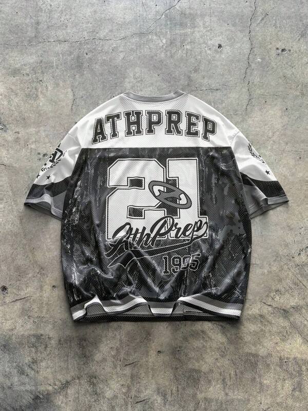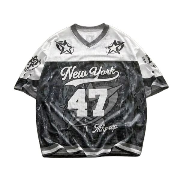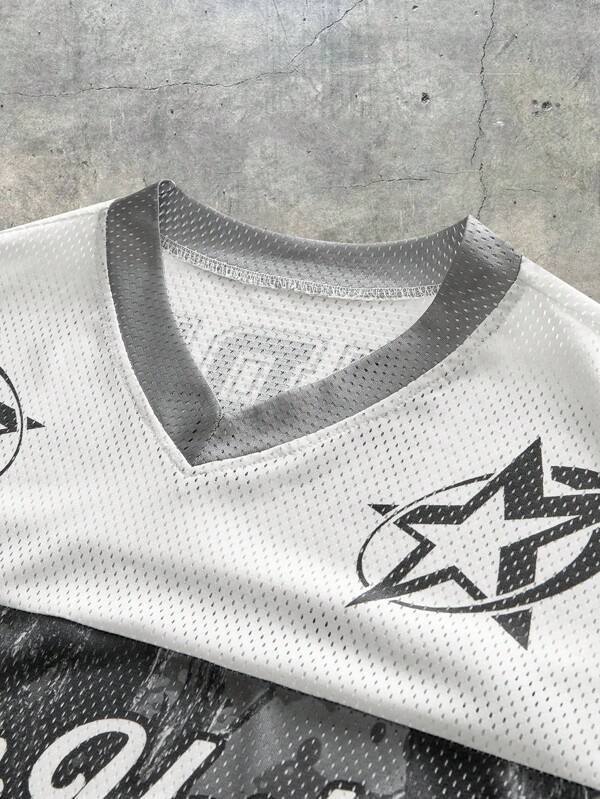 เสื้อยืดผู้ชายสไตล์สปอร์ตคอวีพิมพ์ลายแนวสตรีทแวร์เสื้อยืดสีดำสีขาวโอเวอร์ไซส์ลายกราฟิกฮิปฮอปทรงโอเวอร์ไซส์