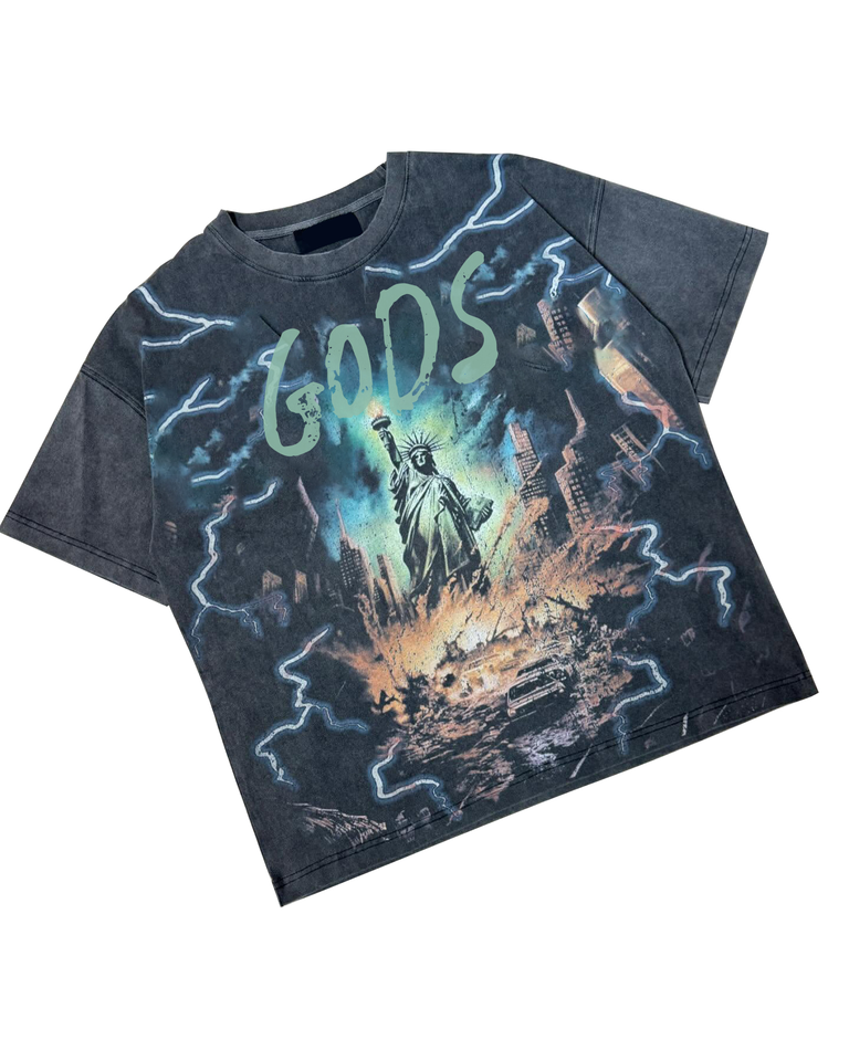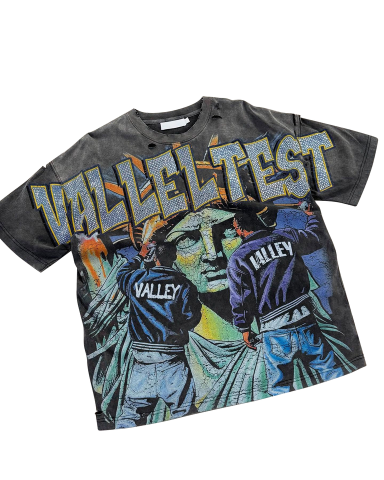 เสื้อยืดสตรีทแวร์ทรงโอเวอร์ไซส์ 100% โพลีเอสเตอร์ เนื้อผ้าหนา ODM รับผลิตตามแบบ พิมพ์ลายกราฟิก ล้างสีแบบ Acid Wash ดีไซน์กระเป๋าประดับคริสตัล แห้งเร็ว