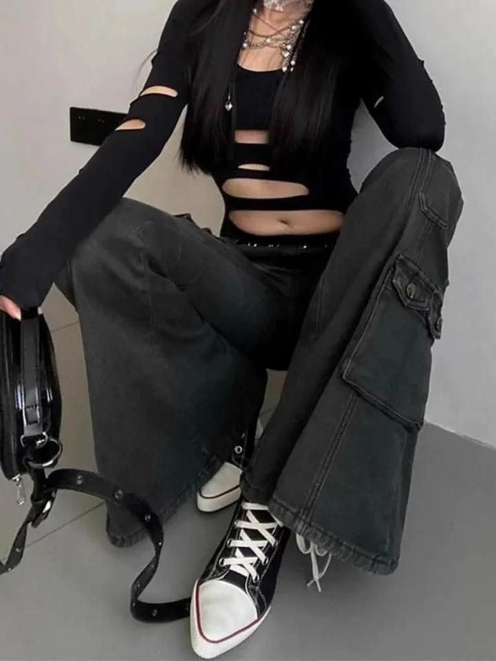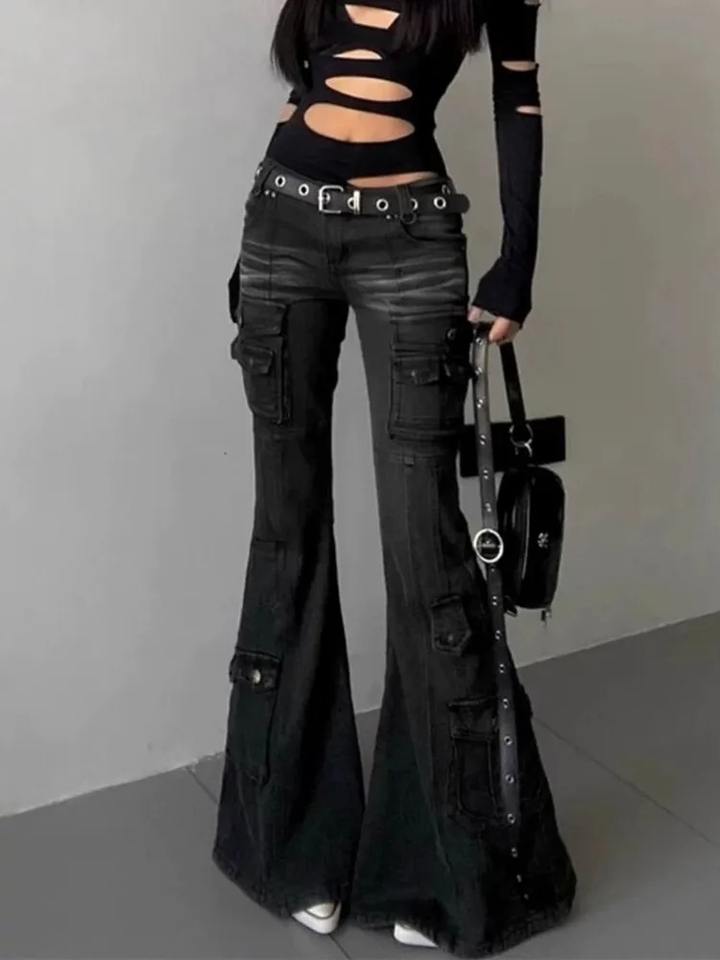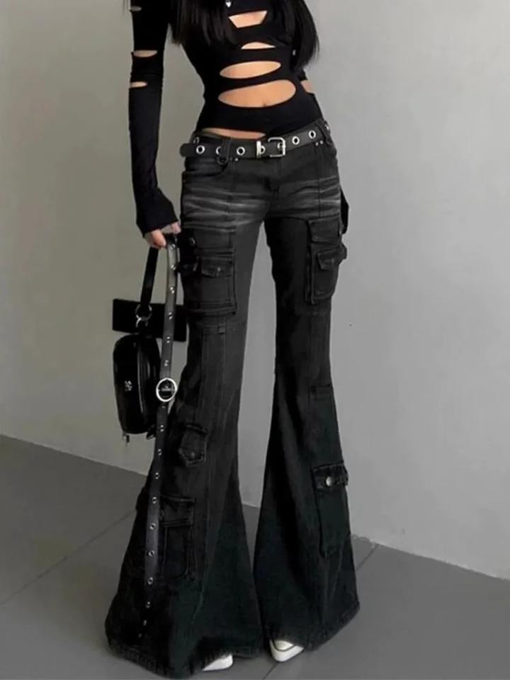Streetwear Vintage Black Slim Flare Cargo Jeans Pants Women Clothing Multi Pockets Lady Trousers