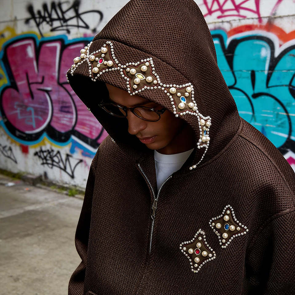 เสื้อฮู้ดสตรีทแวร์แบบมีซิปสำหรับผู้ชายและผู้หญิง พิมพ์ลายเพชรแบบดรอปสกรีน ทรงโอเวอร์ไซส์ สไตล์ฮิปฮอป ตกแต่งด้วยคริสตัลแบบกำหนดเอง