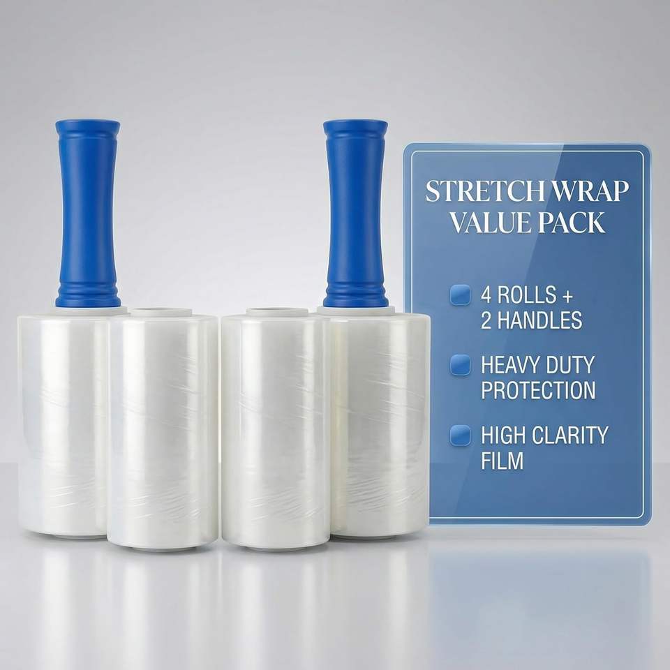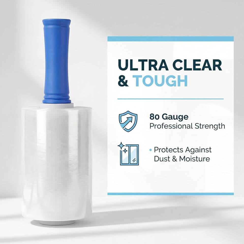 ฟิล์มยืดพันพาเลทสำหรับงานหนัก ฟิล์มพลาสติกใสแบบมันเงา พร้อมหูจับเสริมแรง เกรดสำหรับบรรจุภัณฑ์ ขนส่ง พาเลท เฟอร์นิเจอร์