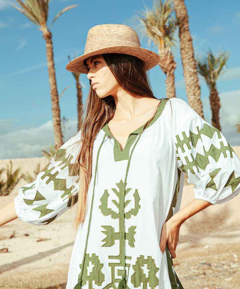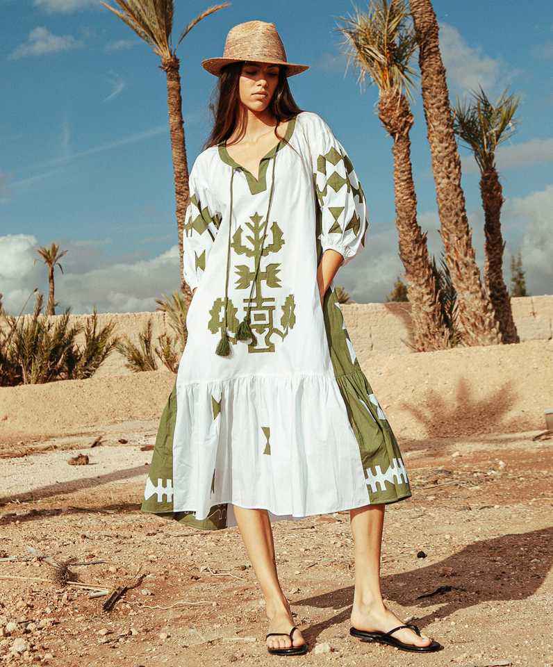 ชุดเดรสผ้าคอตตอนเนื้อนุ่มพร้อมศิลปะการปะติดแบบย้อนกลับตกแต่งด้วยสีธรรมชาติรอบเอวสวมใส่ง่าย