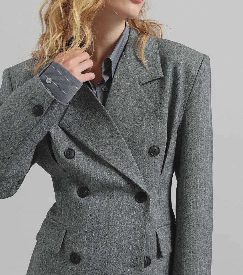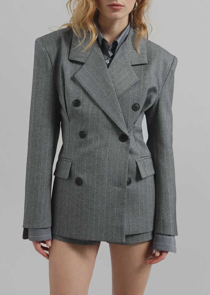 เสื้อเบลเซอร์กำมะหยี่ลายทางแบบกระดุมสองแถว พร้อมงานปัก ป้องกันรอยยับ สีเทาเมลันจ์