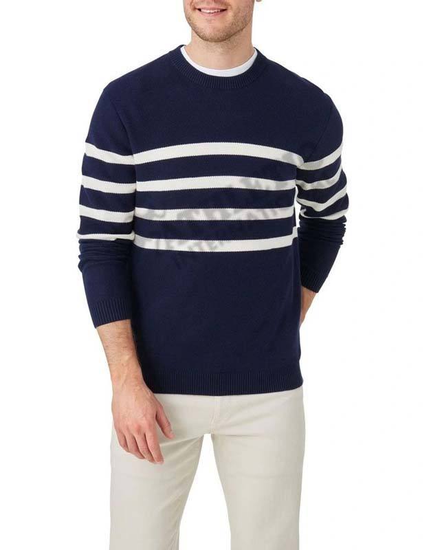 เสื้อสเวตเตอร์คอกลมลายทางสีฟ้าขาวและน้ำเงินแขนยาวเสื้อสเวตเตอร์ออกกำลังกายแบบลำลอง