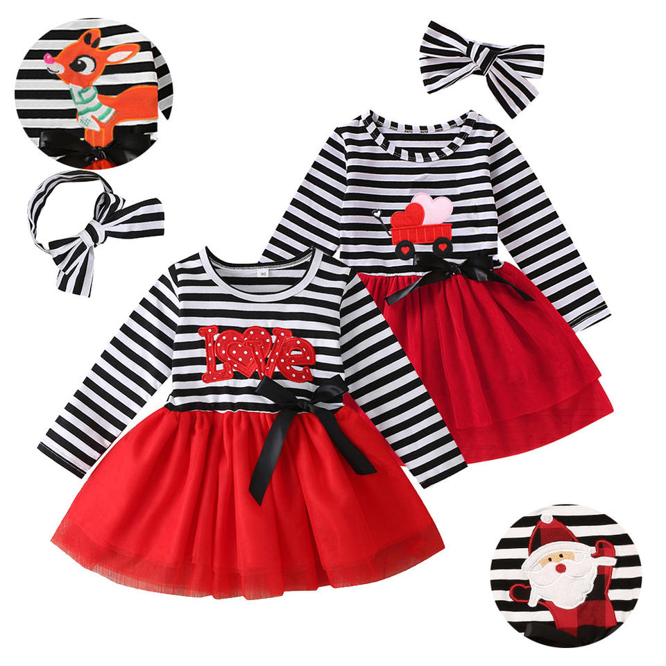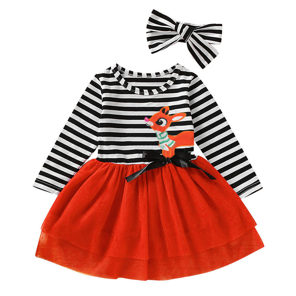 ชุดเดรสเด็กผู้หญิงแขนยาวลายปักลายกวางสีน้ำตาลสำหรับงานปาร์ตี้คริสต์มาส