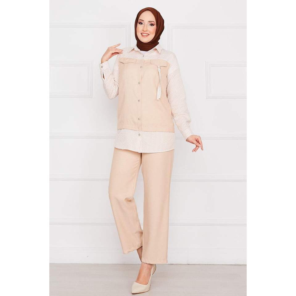 ชุดสูท2ชิ้นสีเบจชุด2ชิ้นมีฝากระเป๋าลายทาง