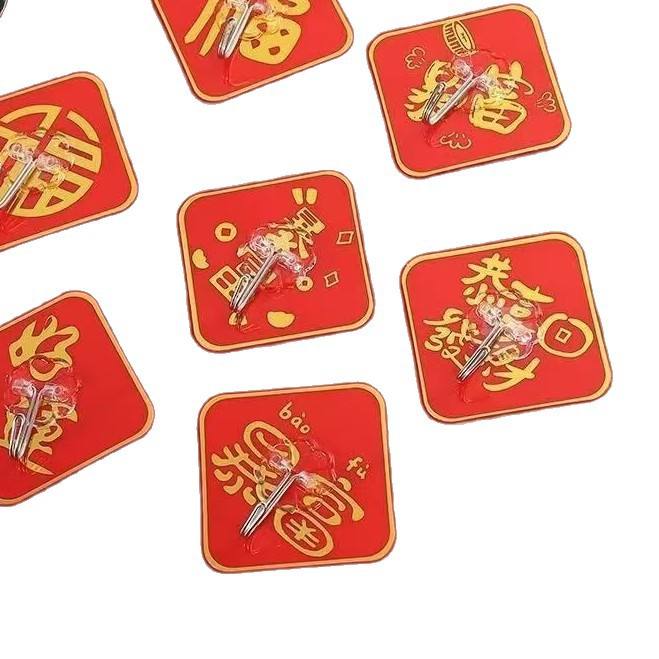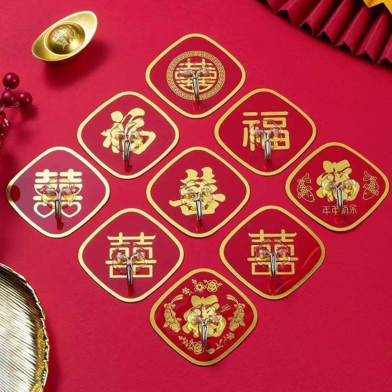ตะขอรูปตัวอักษร "ฟู่" แข็งแรงและสวยงาม ตะขอแบบมีรูติดกาว ของตกแต่งผนังงานแต่งงานแบบจีนสีแดง รับน้ำหนักได้มาก ไม่ทิ้งร่องรอย