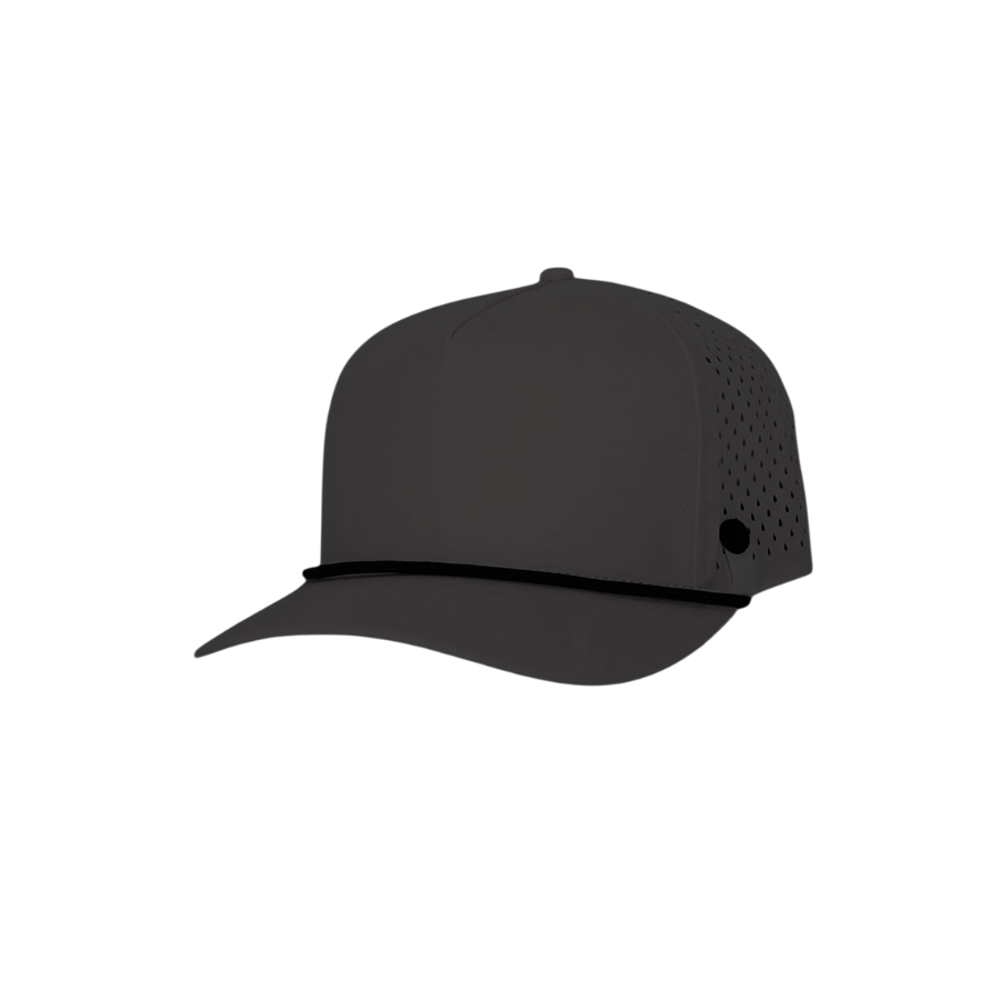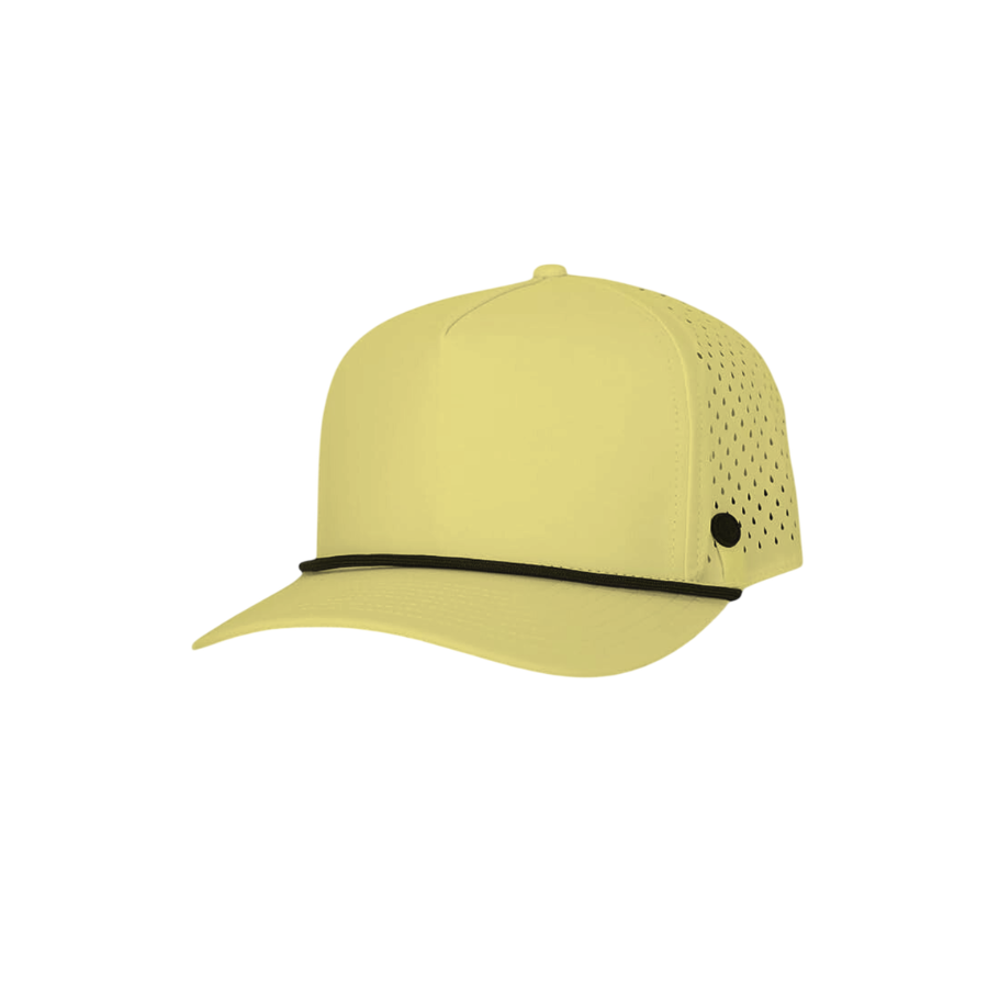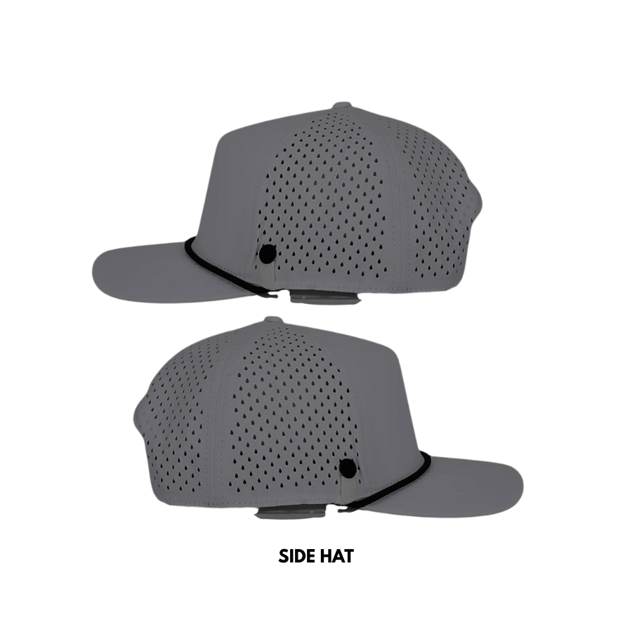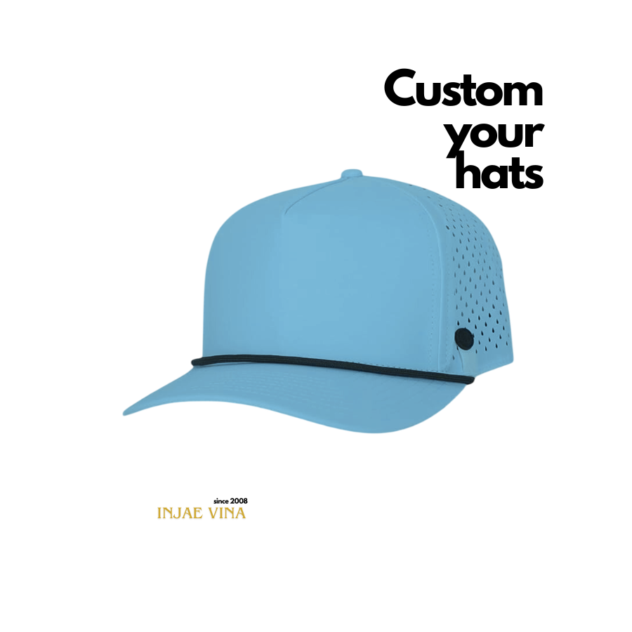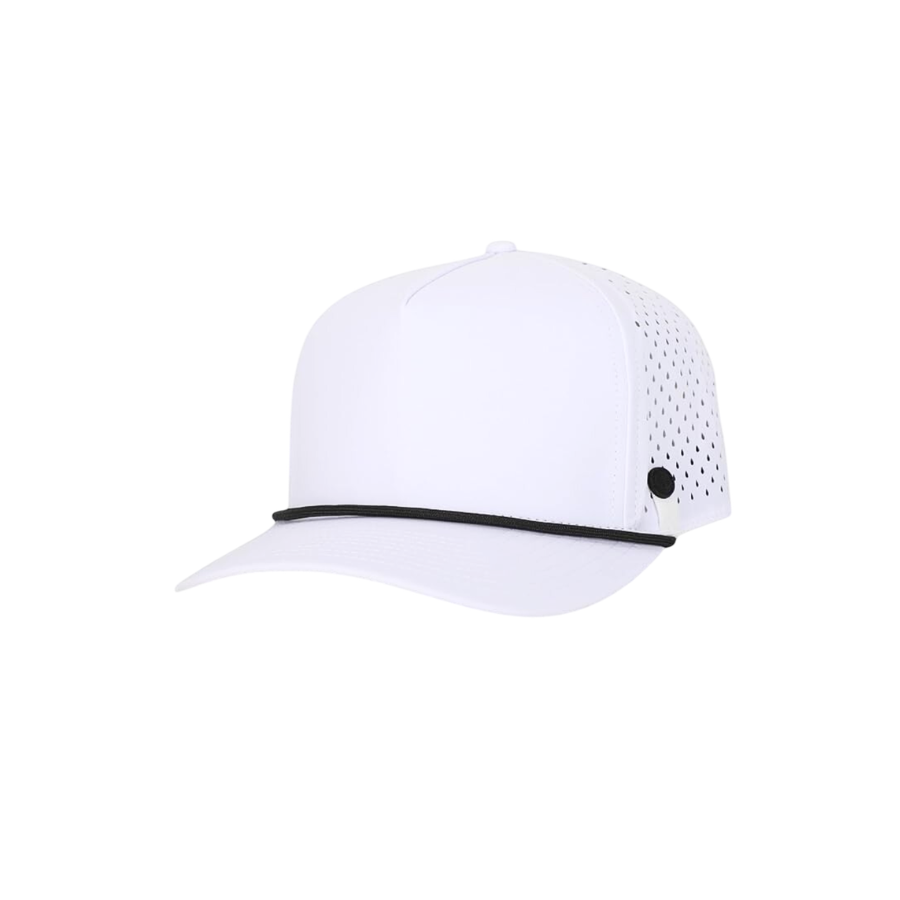 หมวกกอล์ฟแบบ 5 แผง ทรงโค้ง ดีไซน์ทันสมัย กันน้ำ พร้อมเชือกตกแต่ง ปีกโค้งสวยงาม ติดกระดุมพลาสติก ระบายอากาศด้วยเลเซอร์
