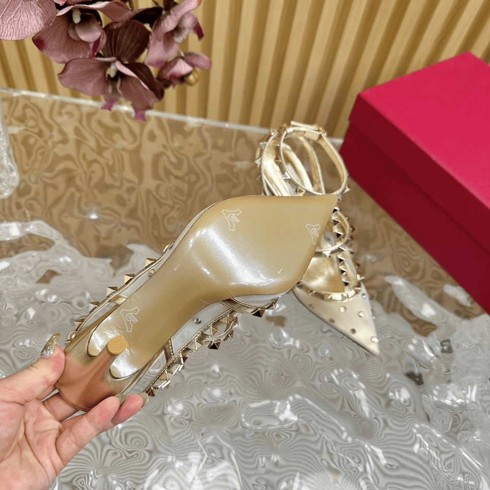 รองเท้าส้นเข็มหัวแหลมประดับหมุด พร้อมสายรัดข้อเท้าและสายรัดรูปตัว T สำหรับผู้หญิง สวมใส่ในงานทางการและงานกลางคืน วาเลน