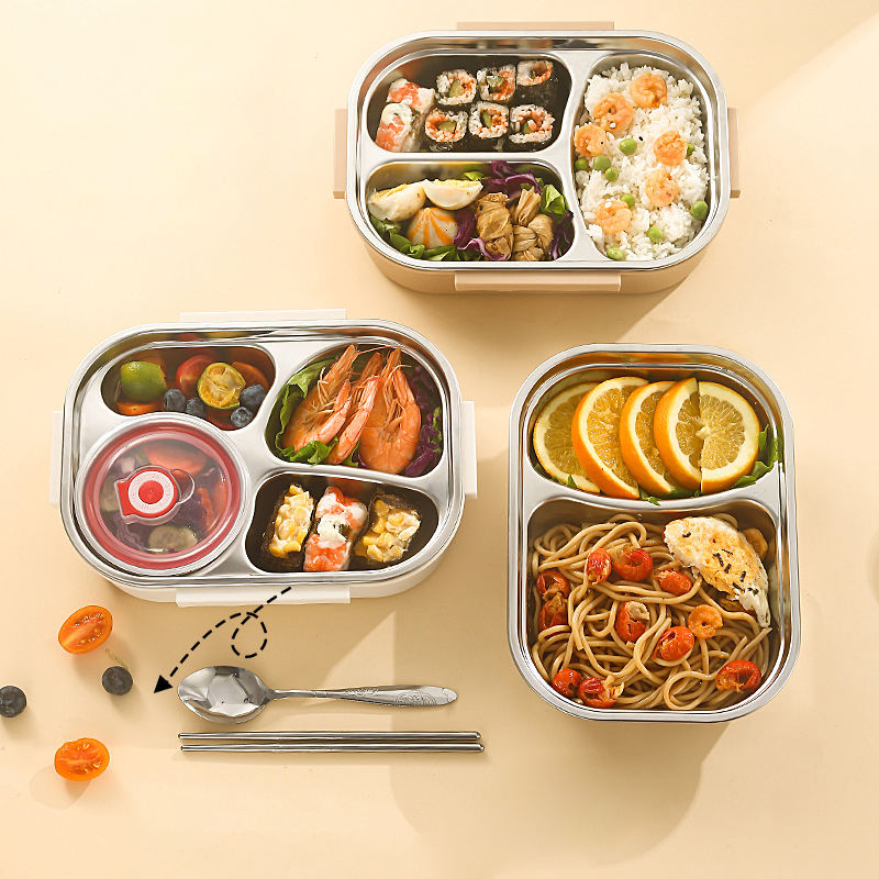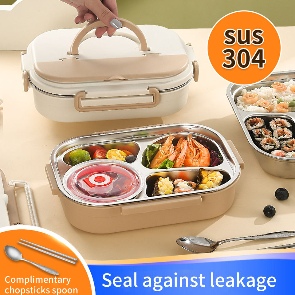 กล่องเบนโตะสแตนเลส304แบบพกพาสำหรับนักเรียนกล่องอาหารกลางวันกันรั่วซึมกันความร้อนพร้อมชุดเครื่องใช้บนโต๊ะอาหาร